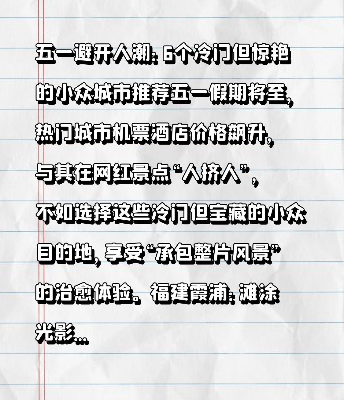 五一假期将至,热门城市机票酒店价格飙升,与其在网红景点“人挤人”,不如选择这些冷门但宝藏的小众目的地,享受“承包整片风景”的治愈体验。
