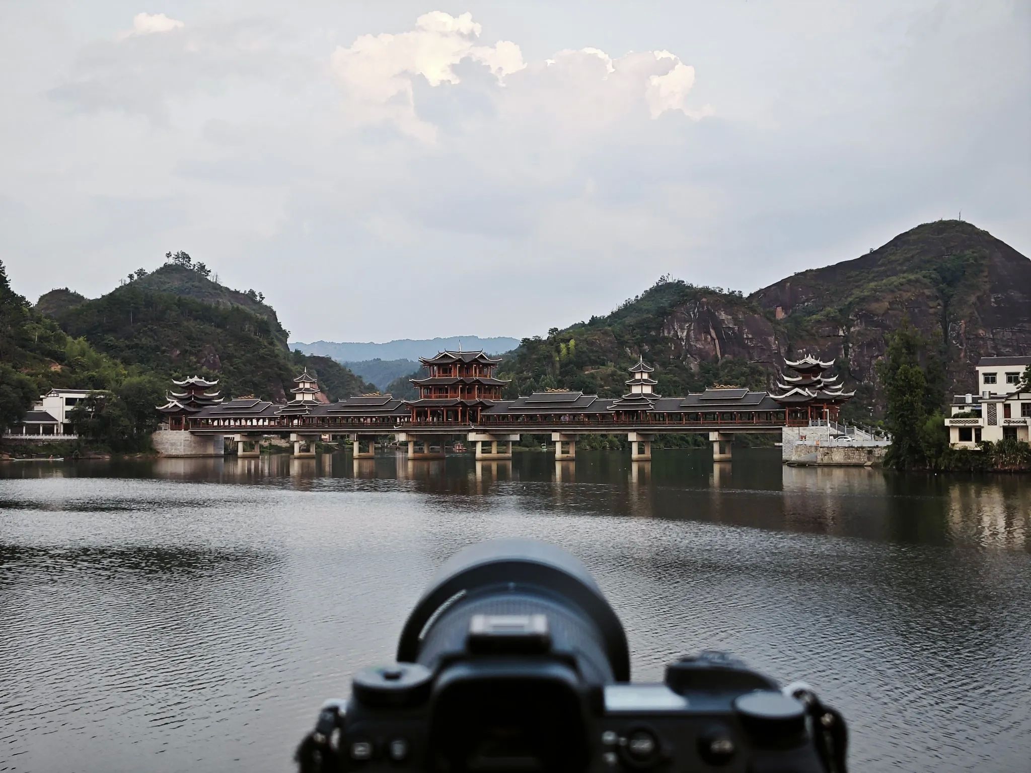 日影西斜时,一座飞檐斗拱的廊桥横跨河湾。**思蒙风雨桥**全长174米,宛若巨龙卧波。抚过98根巨柱缓步穿行,见乡民倚栏闲话,孩童追逐嬉闹。主楼三层翘角刺破流云,夕照为17米高的木构镀上金边,百年匠心与丹霞同辉。