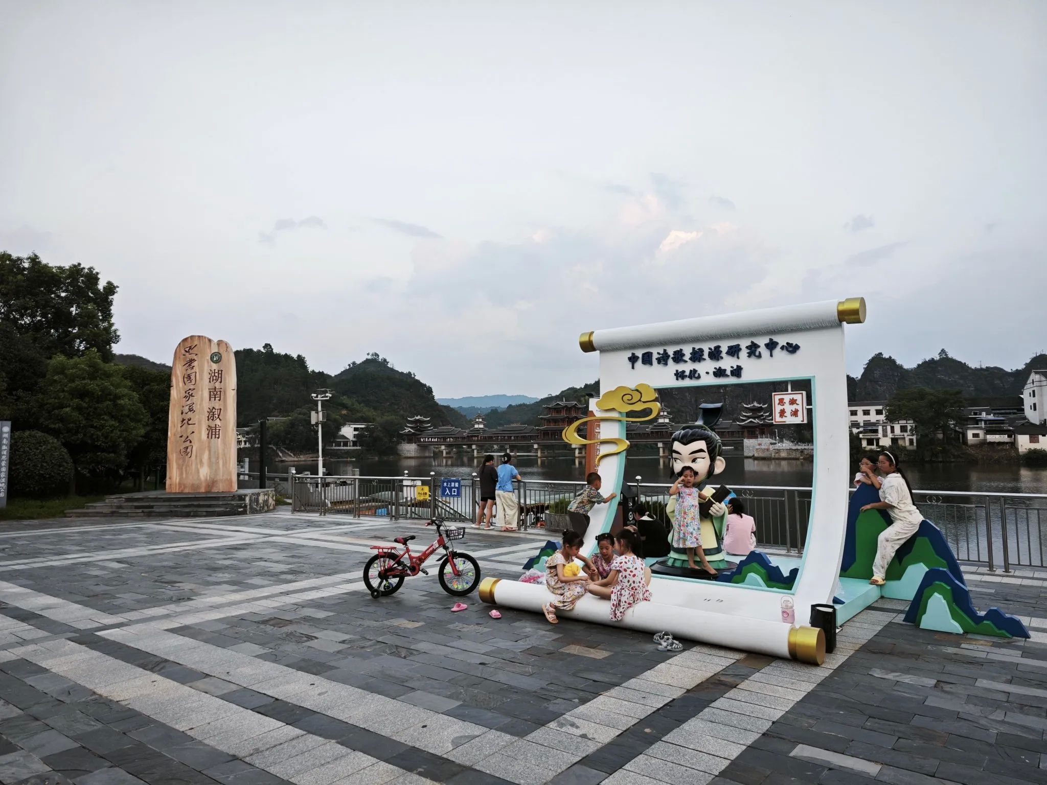 弃舟登岸,沿新修栈道攀向**桃源洞天**。初觉洞口平淡无奇,及至踏入豁然开朗。半山洞穴如天然观景台:远处农舍白墙点染梯田青绿,溆水蜿蜒如银链串起盆景般的峰丛。传说屈原见此景而暂忘愁绪,向农人学唱山歌,将“丝茅”之名改为“思蒙”——“此地静心养性,可启思发蒙啊!”