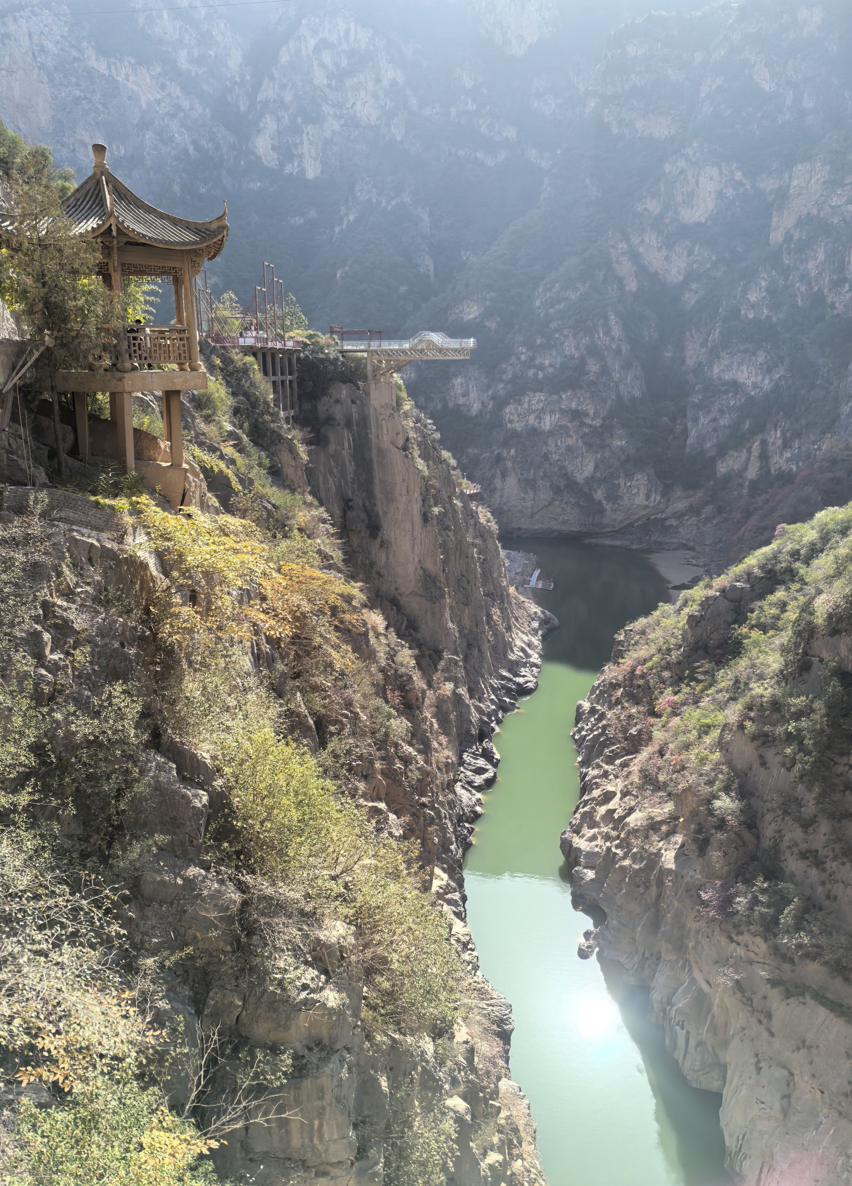 昨天的天气太给力了,可以说是2025年多雨秋季中难得一见的好天气。女婿驾车,女儿、老伴与我,晨8点由西安出发,到陕西省泾阳县郑国渠景区饱览那大好的山河风光。到景区后,大巴车沿着险峻蜿蜒的山间公路,七拐八拐,穿越十几个隧道,经过数不清的弯道,将游客送到了水面浩淼、平静如镜的碧绿的天然湖泊郑国湖湖畔。我们登上游船,徜徉在碧如宝石的宽阔湖面,两岸㶷丽的景色,不由得啧啧称叹。