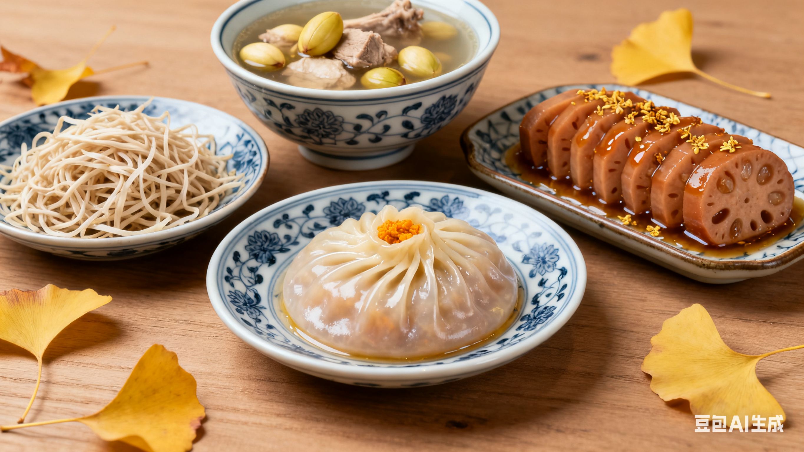赏完银杏,别忘了尝尝扬州的秋日限定美味。热乎乎的蟹黄汤包皮薄汁鲜,一口咬下去满是蟹膏的鲜香;烫干丝细嫩爽口,搭配银杏果炖鸡汤,鲜醇滋补;再来一份香甜软糯的桂花糖藕,甜而不腻,满口都是秋的味道。