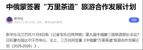 11月8日,中俄蒙三国在蒙古国达尔汗市签署《中俄蒙"万里茶道"旅游合作发展计划(2025-2026)》共同开发旅游线路、推出跨境自驾游品牌、提升旅游便利化水平。