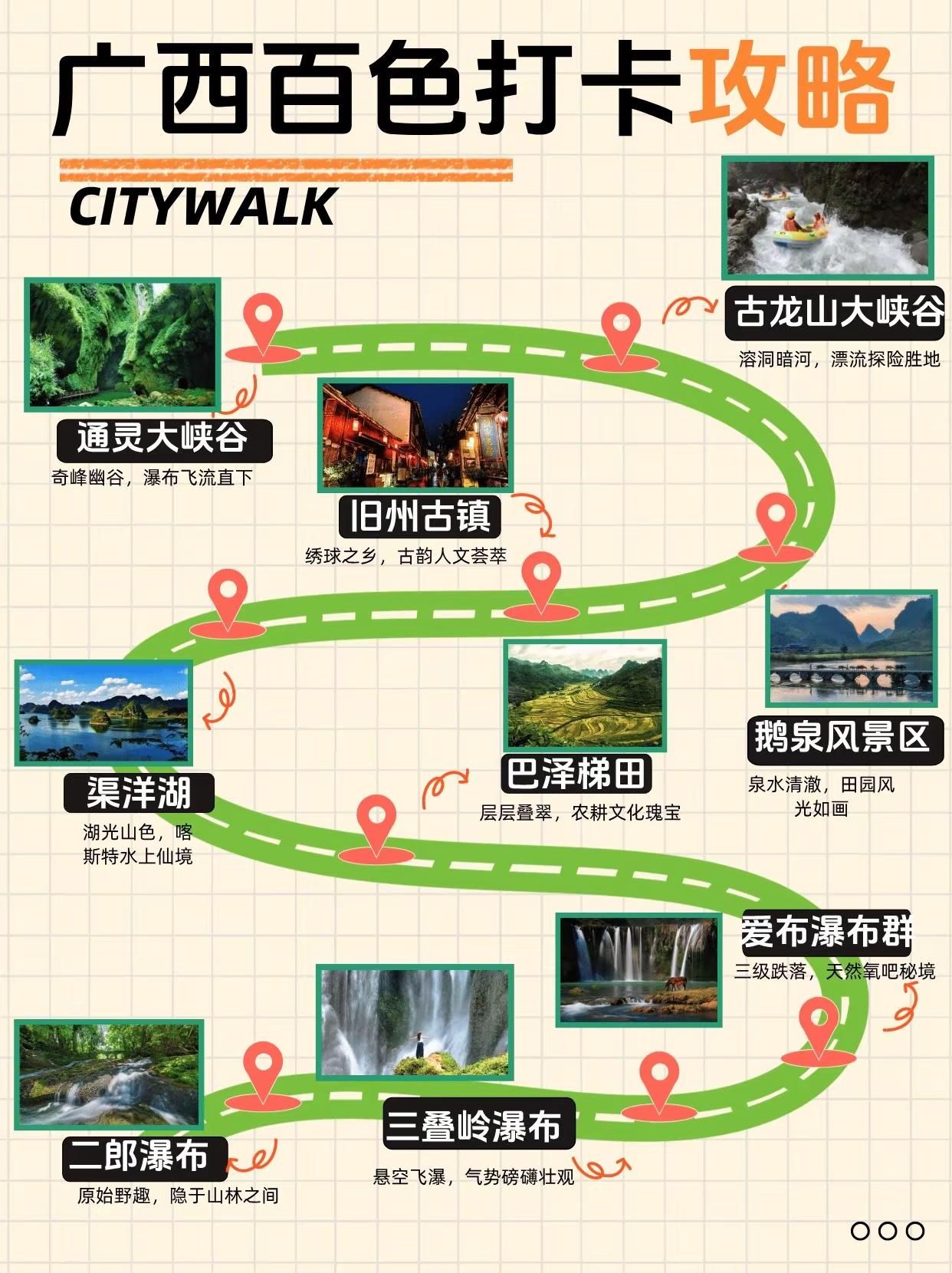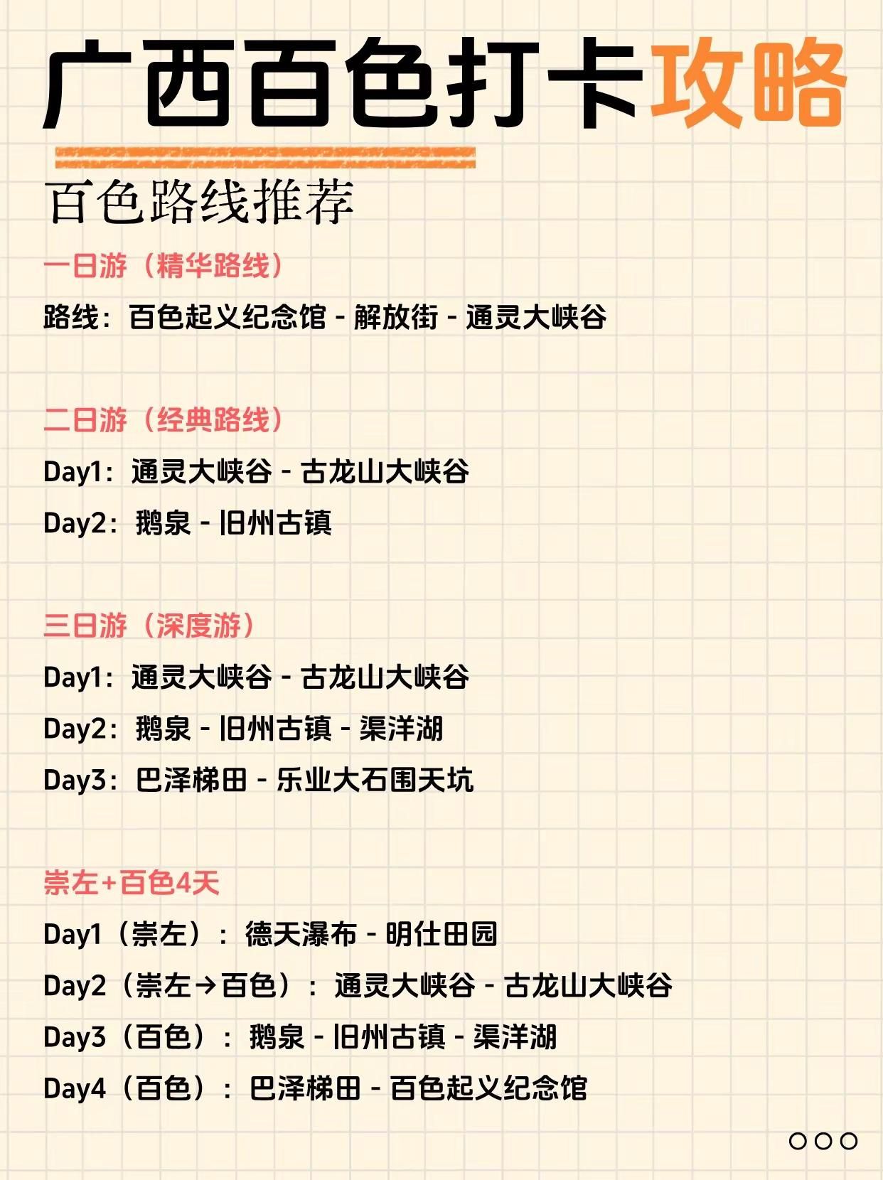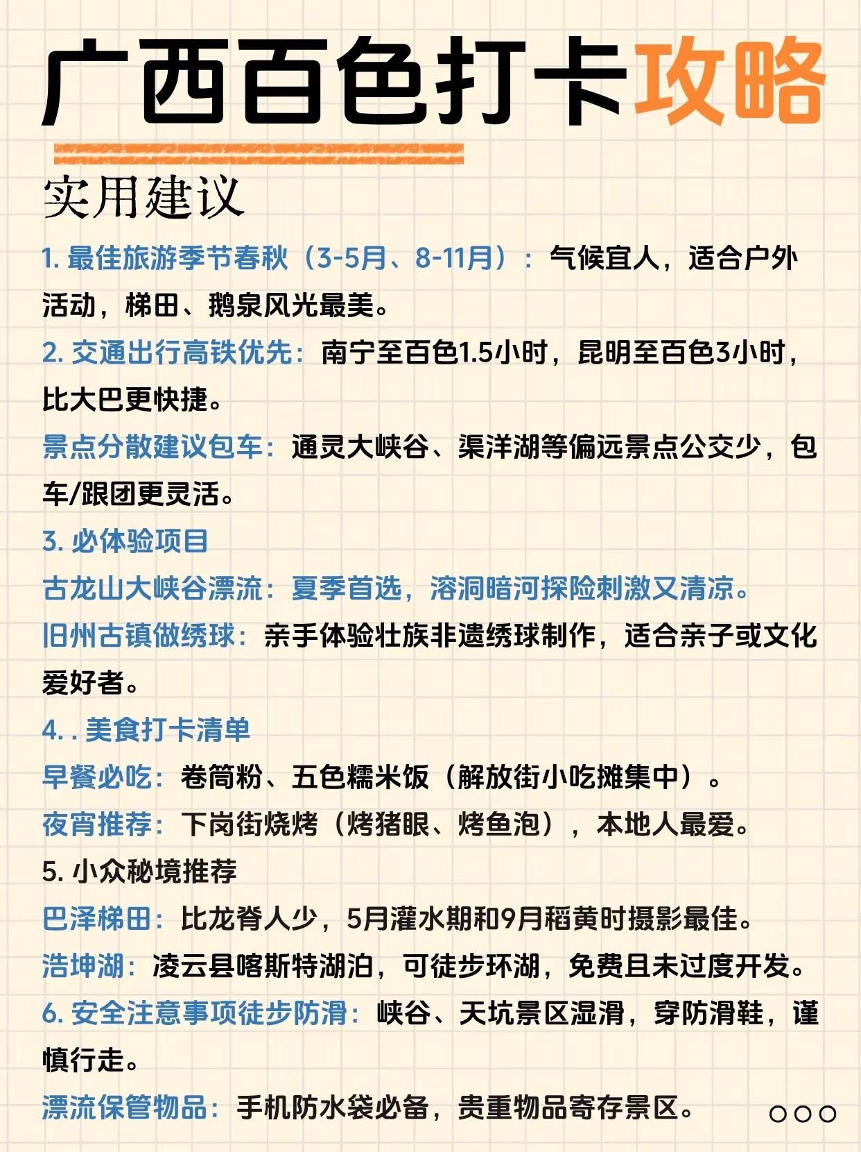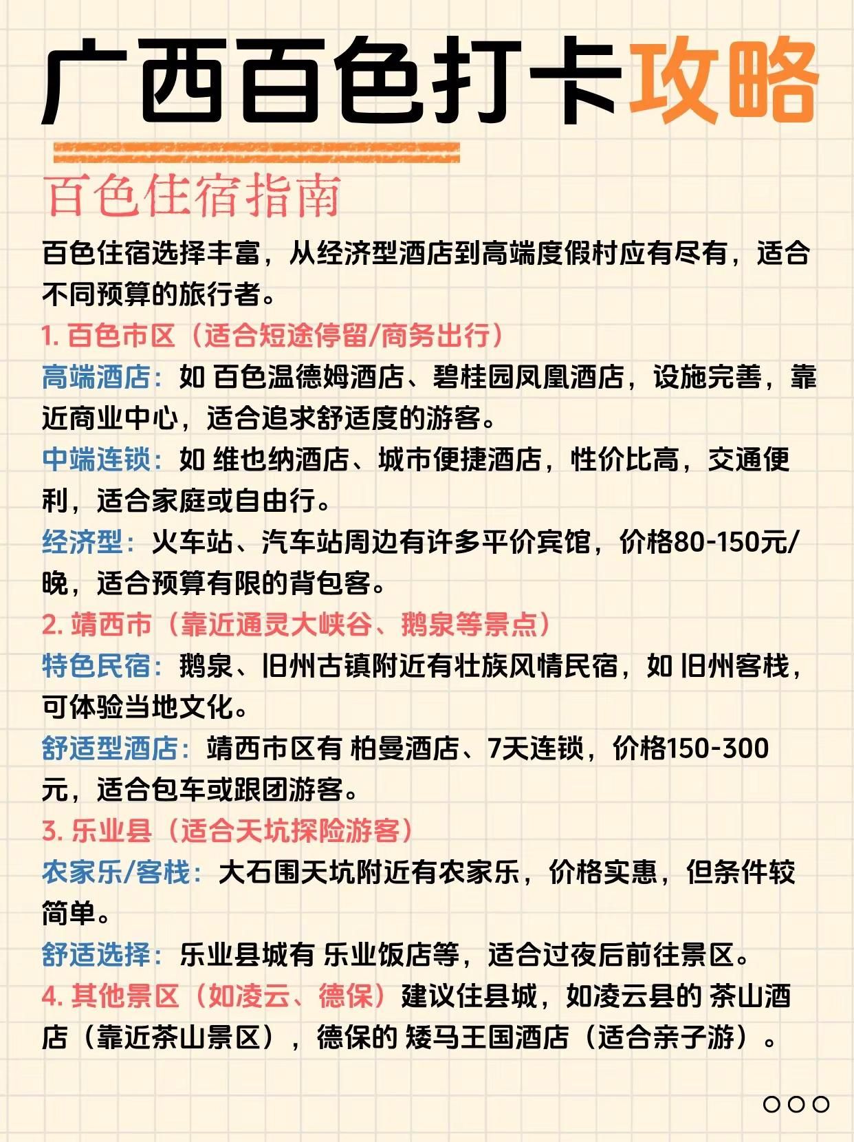 终于有人把百色旅游说明白了!来广西必打卡。通灵大峡谷——奇峰幽谷,瀑布飞流直下古龙山大峡谷——溶洞暗河,漂流探险胜地鹅泉风景区——泉水清澈,田园风光如画旧州古镇——绣球之乡,古韵人文荟萃渠洋湖——湖光山色,喀斯特水上仙境巴泽梯田——层层叠翠,农耕文化瑰宝爱布瀑布群——三级跌落,天然氧吧秘境三叠岭瀑布——悬空飞瀑,气势磅礴壮观二郎瀑布——原始野趣,隐于山林之间-百色路线指南百色一日游路线:百色起义纪念馆 - 解放街 - 通灵大峡谷-百色二日游Day1:通灵大峡谷 - 古龙山大峡谷Day2:鹅泉 - 旧州古镇-百色三日游Day1:通灵大峡谷 - 古龙山大峡谷Day2:鹅泉 - 旧州古镇 - 渠洋湖Day3:巴泽梯田 - 乐业大石围天坑-崇左+百色4日游Day1(崇左):德天瀑布 - 明仕田园Day2(崇左百色):通灵大峡谷 - 古龙山大峡谷Day3(百色):鹅泉 - 旧州古镇 - 渠洋湖Day4(百色):巴泽梯田 - 百色起义纪念馆-百色美食1. 五色糯米饭 2. 靖西香糯粽3. 隆林腊肉 4. 田东芒果酸嘢5. 西林麻鸭6. 乐业猕猴桃酸汤鱼7. 德保猪血肠8. 凌云白毫茶香鸡-#创作者扶持计划 #广西旅游 #百色 #靖西 #通灵大峡谷