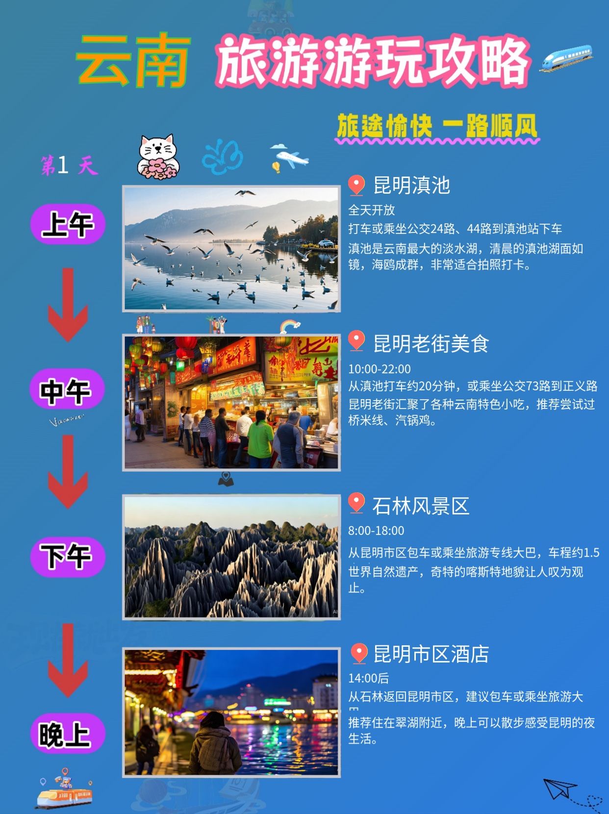 * 交通:从石林返回昆明市区,建议包车或乘坐旅游大巴。