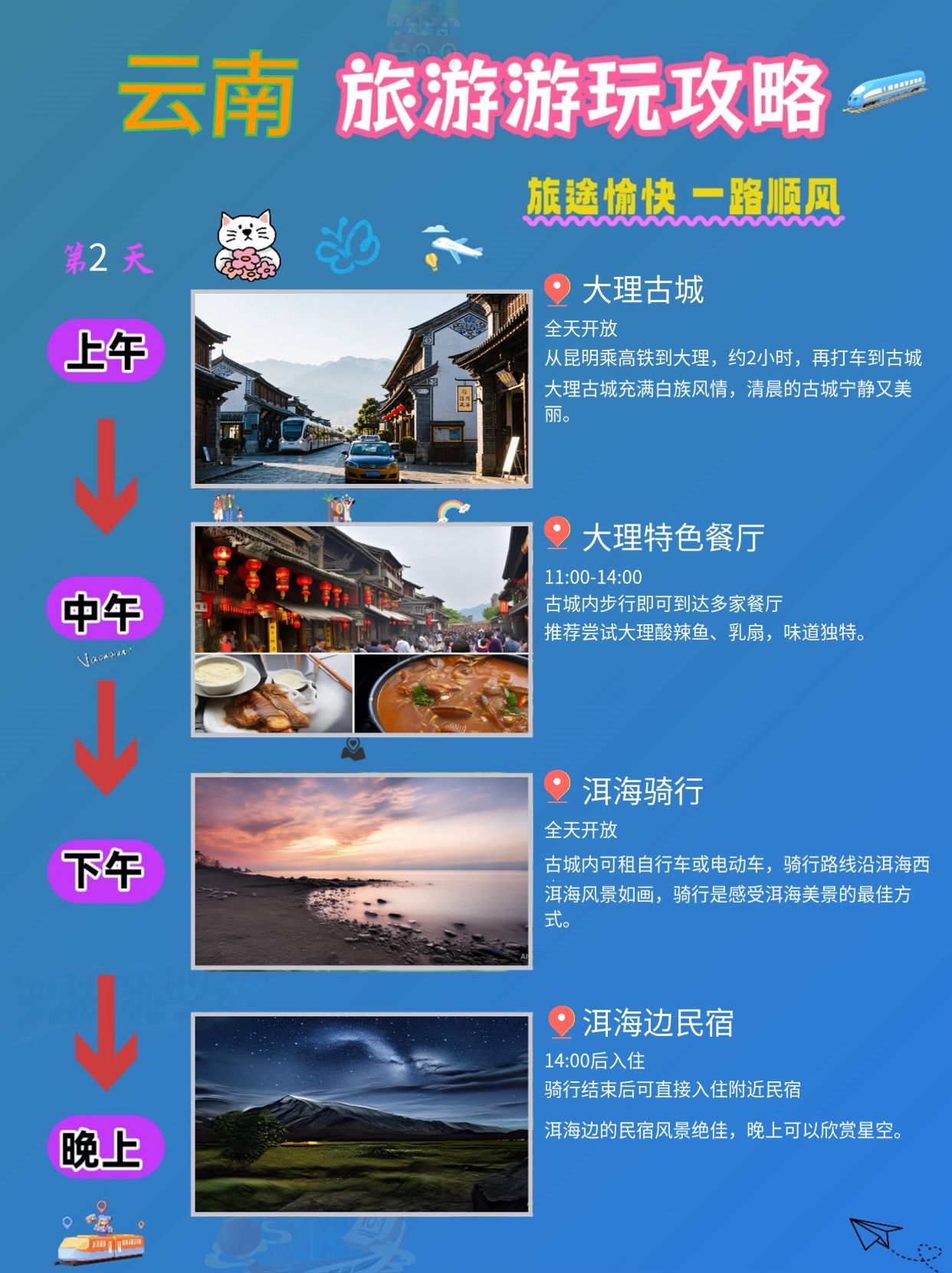 * 交通:从昆明乘高铁到大理,约 2 小时,再打车到古城。