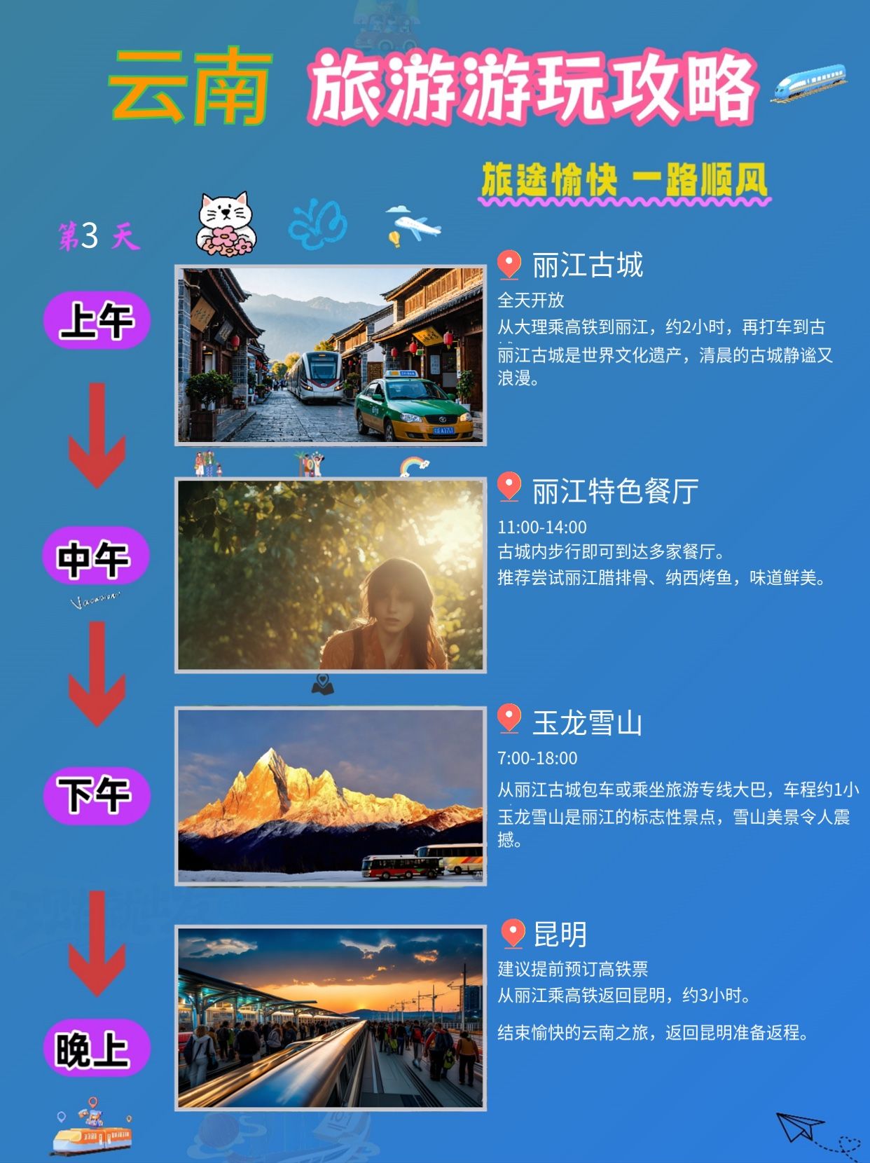 * 交通:从丽江乘高铁返回昆明,约 3 小时。