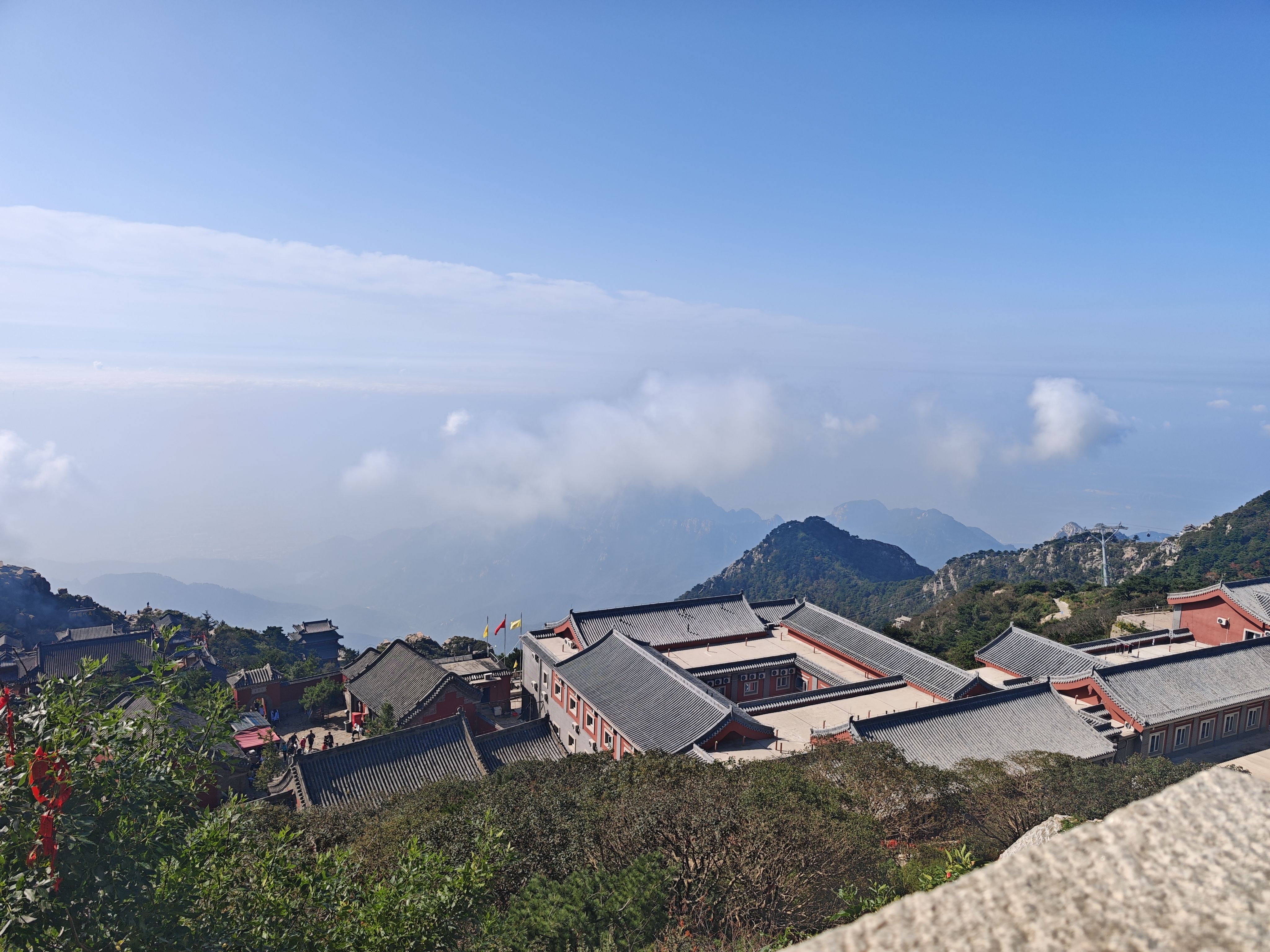 对于体力好的人来讲,游览泰山最经典的路线是从红门出发,我还算是有自知之明,选择从太平村坐大巴到中天门,然后徒步再爬南天门登玉皇顶,上下全程用时三个小时。实际上刚下摆渡车就开始焦虑了,总觉得身体哪哪不舒服,担心背包负重大,怕太阳晒,一切都指向徒步登顶的可能性为零!硬着头皮爬了几十阶石梯,喘气有些吃力,腿肚子抽抽,脚后跟儿隐疼,几度想折回来坐缆车上南天门。此时迎头遇到夜爬下山的队伍,一个个步履轻松,面露得意之色,细看人群中竞有老有小,心下一狠,爬就完了!
