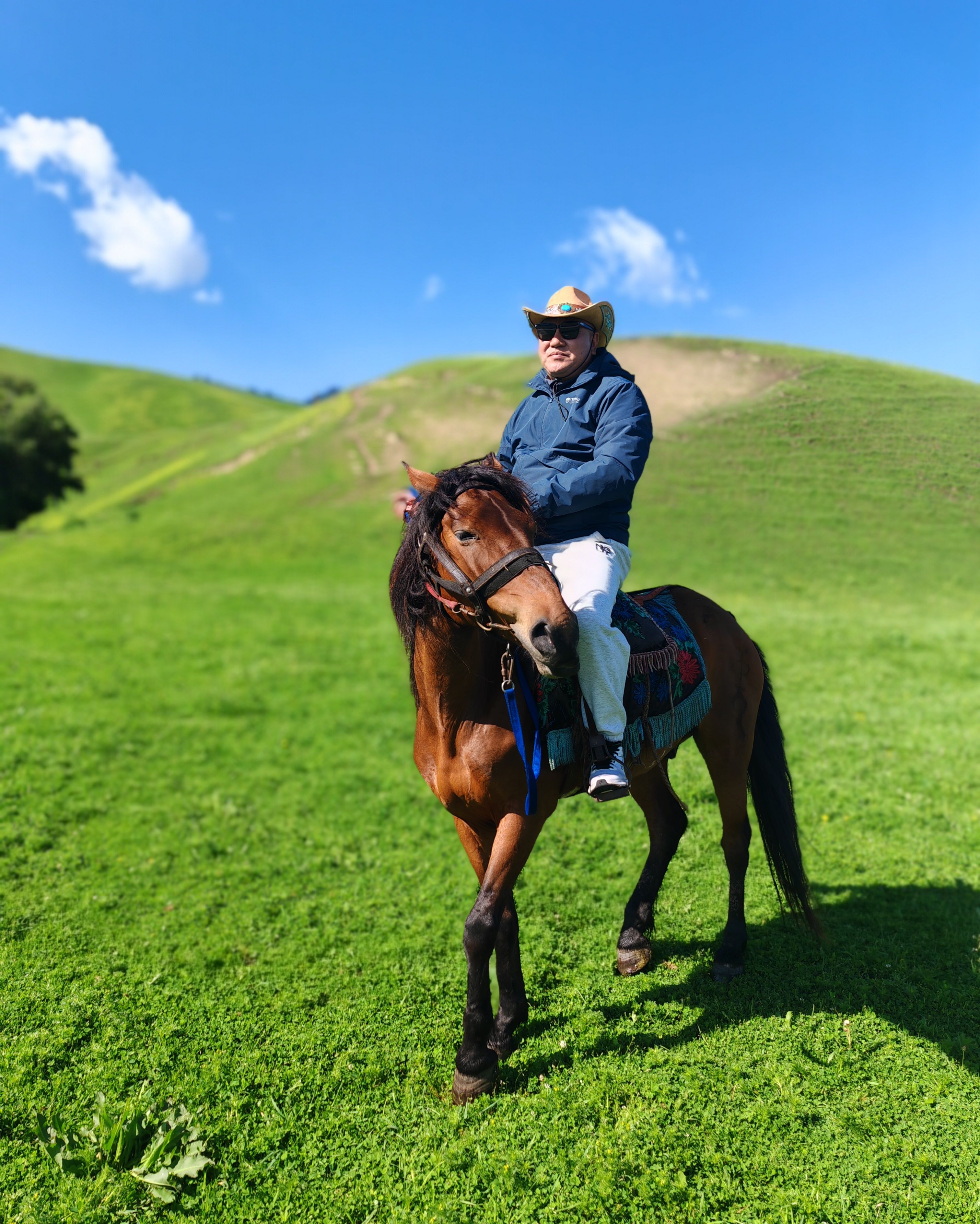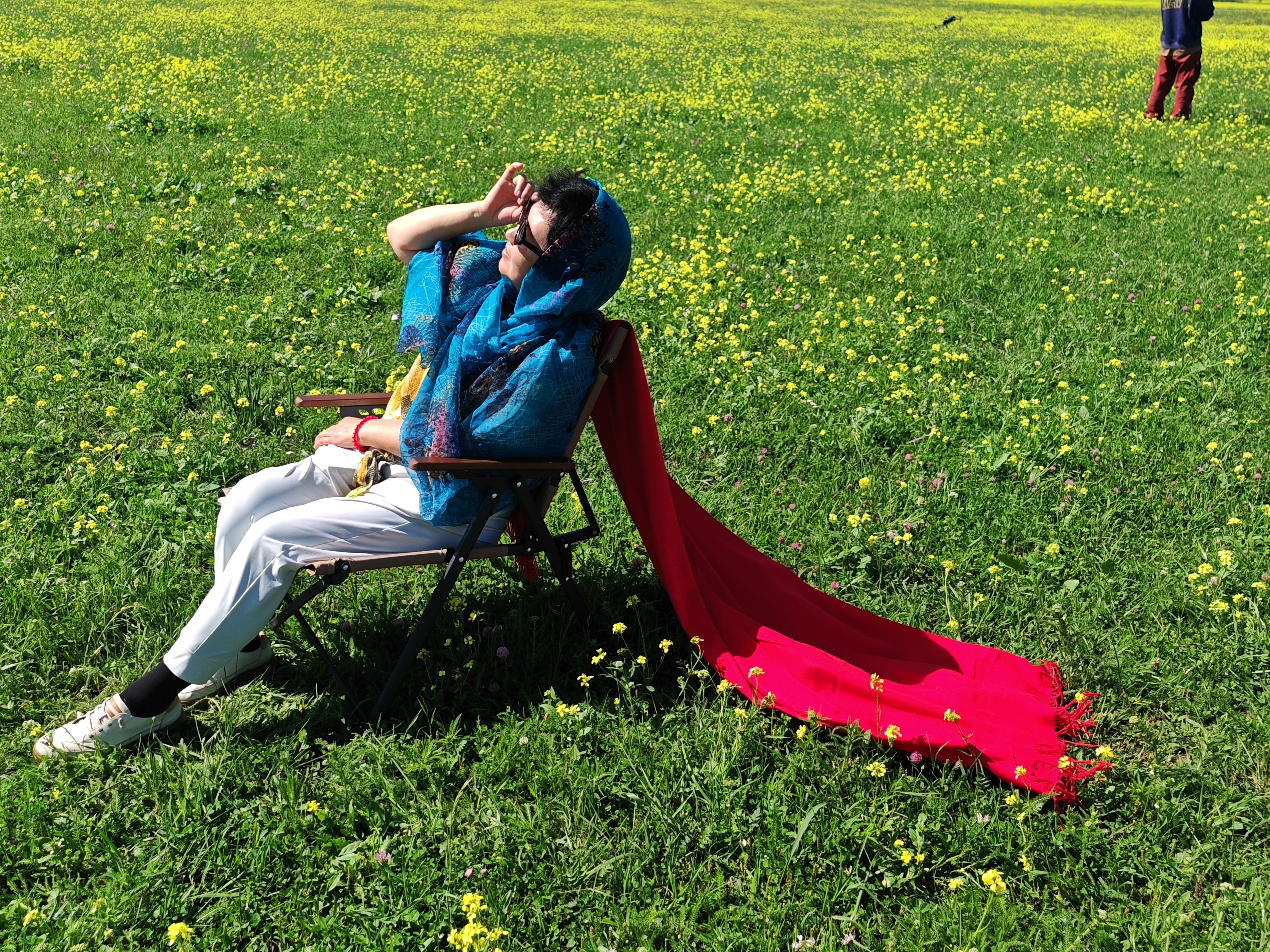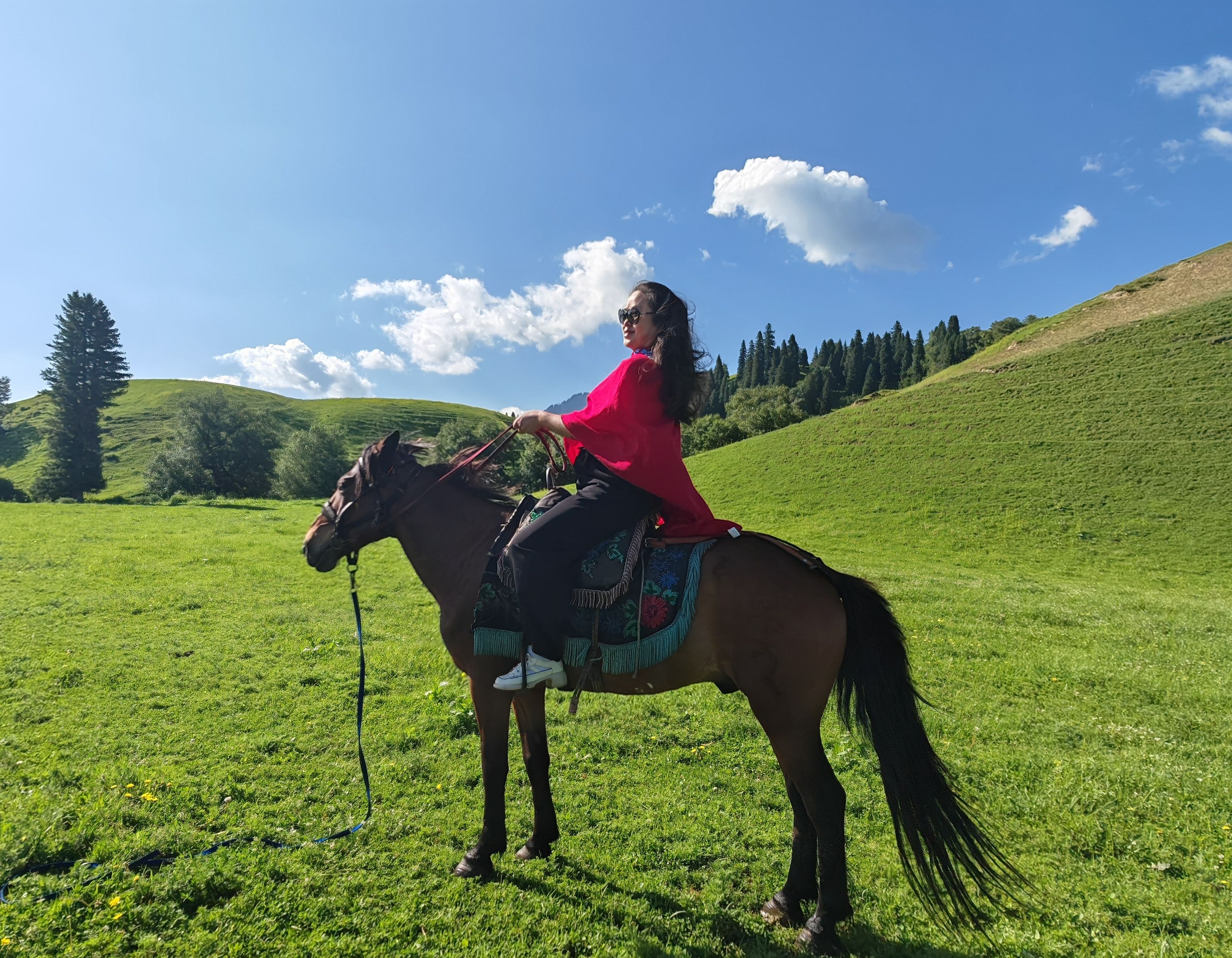两个遛马的汉子走过来,用生硬的普通话问“骑不骑马?”为什么不呢?骑马漫步、花间嗅香、草地拍照、坐在椅子上欣赏白云远山,大家各得其所。目撷山间松色,身披彩虹衣装,我们不再是游览者,而是身心的体验者。你不信吗?你看,正有人举起相机对着我们拍照呢!在这里玩了1个多小时,然后到空中草原和游牧人家打卡拍照,下午4点多离开景区。