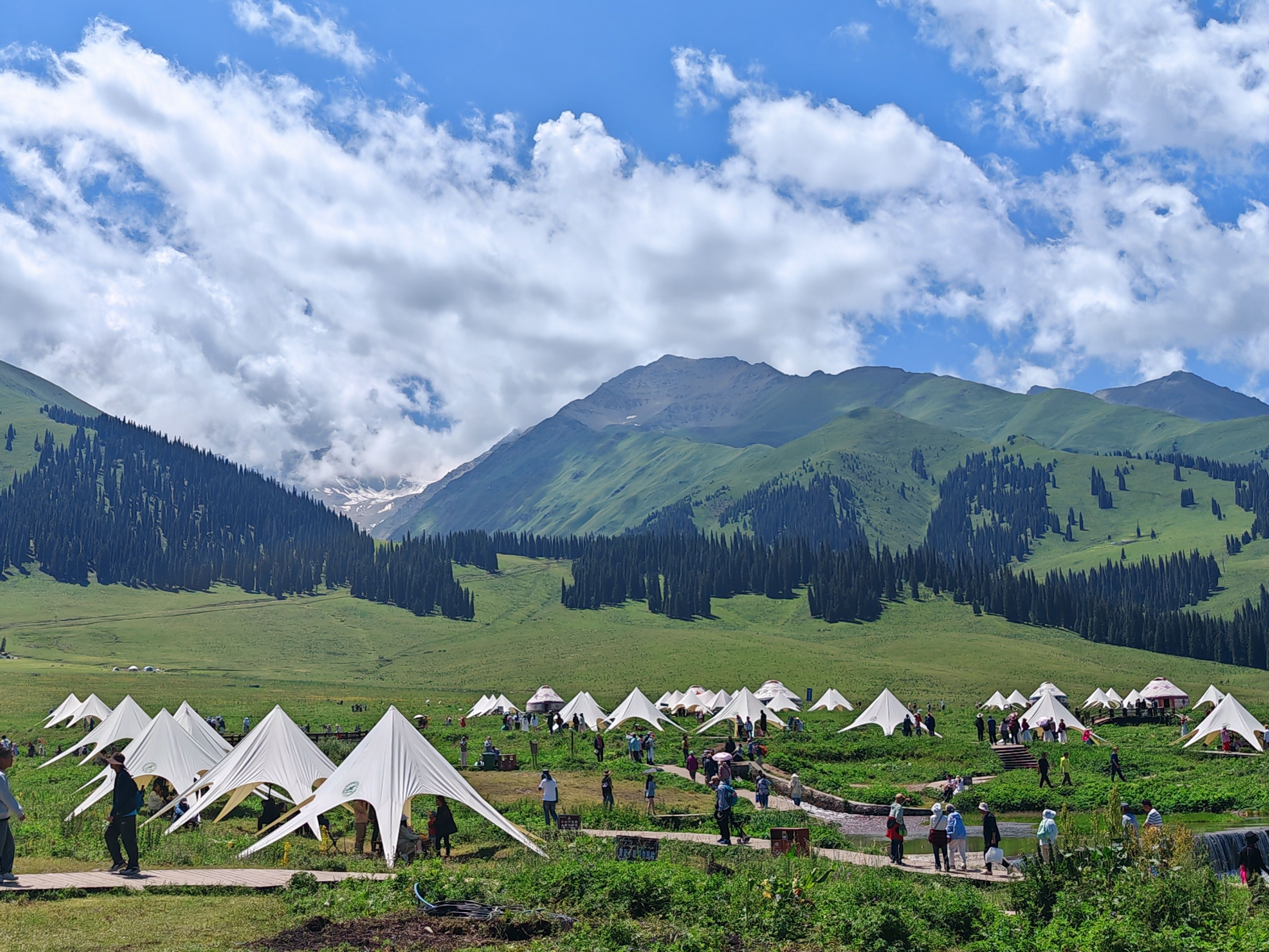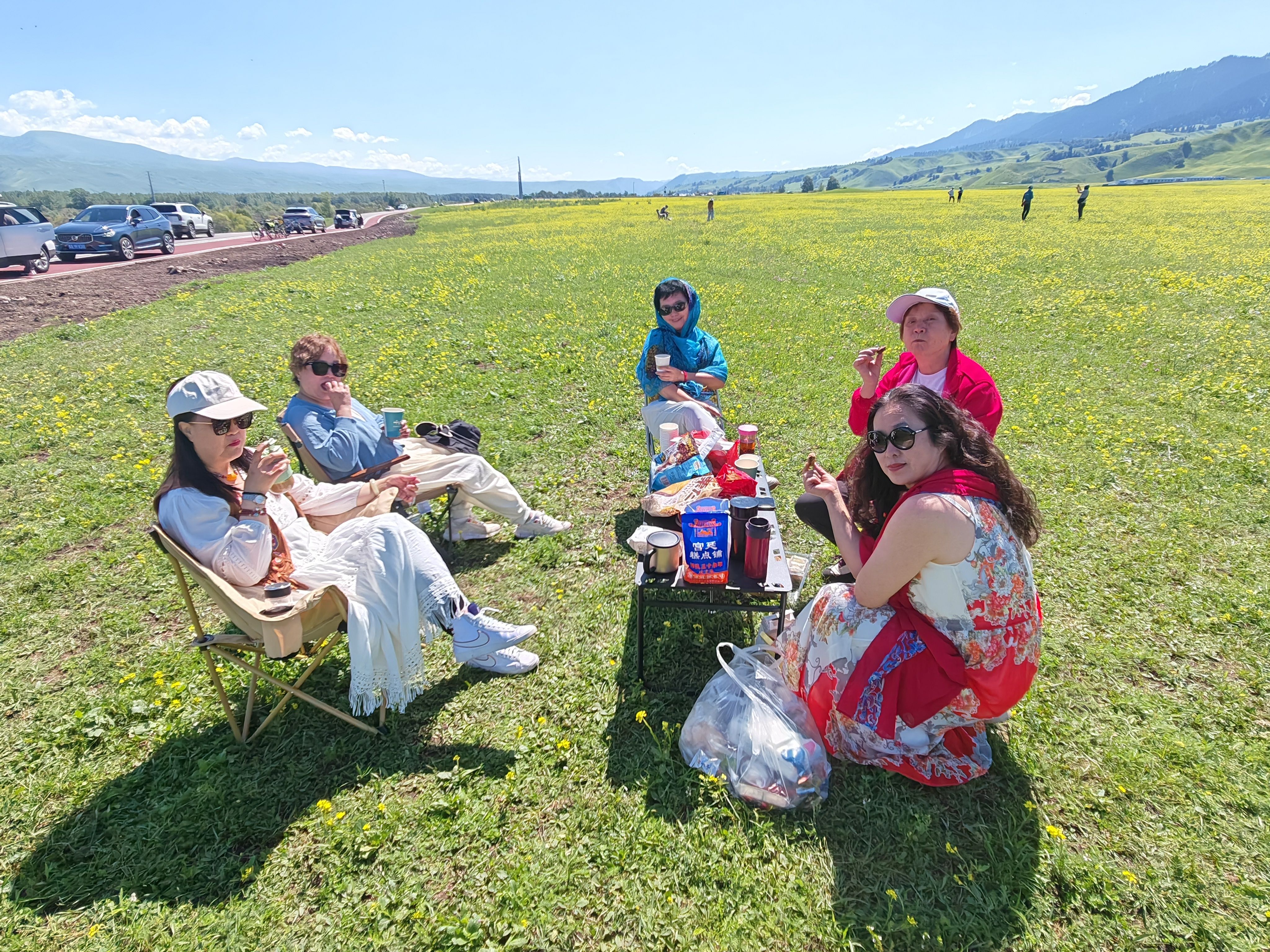 10点出发进那拉提景区。一片开满细碎小花的连绵不绝的牧场展现在眼前,伴着墨绿的山上森林,正是一笔浓墨一抹鲜亮,让牧场生动鲜活。无需再走,停车!拿下折叠座椅,摆上茶点、沏上绿茶、冲上袋装咖啡,我说说赛里木湖畔的星辰和霞光里的天鹅,他们说说伊利咯赞民俗村的五彩斑斓,霍尔果斯口岸的庄严。风景是眼的收获,风情是身的体会,风骨是心的共情。丛哥和老吴拿出无人机,在无比空旷的环境里放飞,来一个鹰的视角。那拉提清清浅浅盈盈欲滴的草,无边无垠像静静的海,逶迤的山峰层林尽染像波涛汹涌的浪,飘逸的云雾漂浮流动生机盎然。这美景鹰看得到不知道,过去的山水诗人想得到看不到,而今天的我们,看得到也知道不用想象,何其有幸啊!