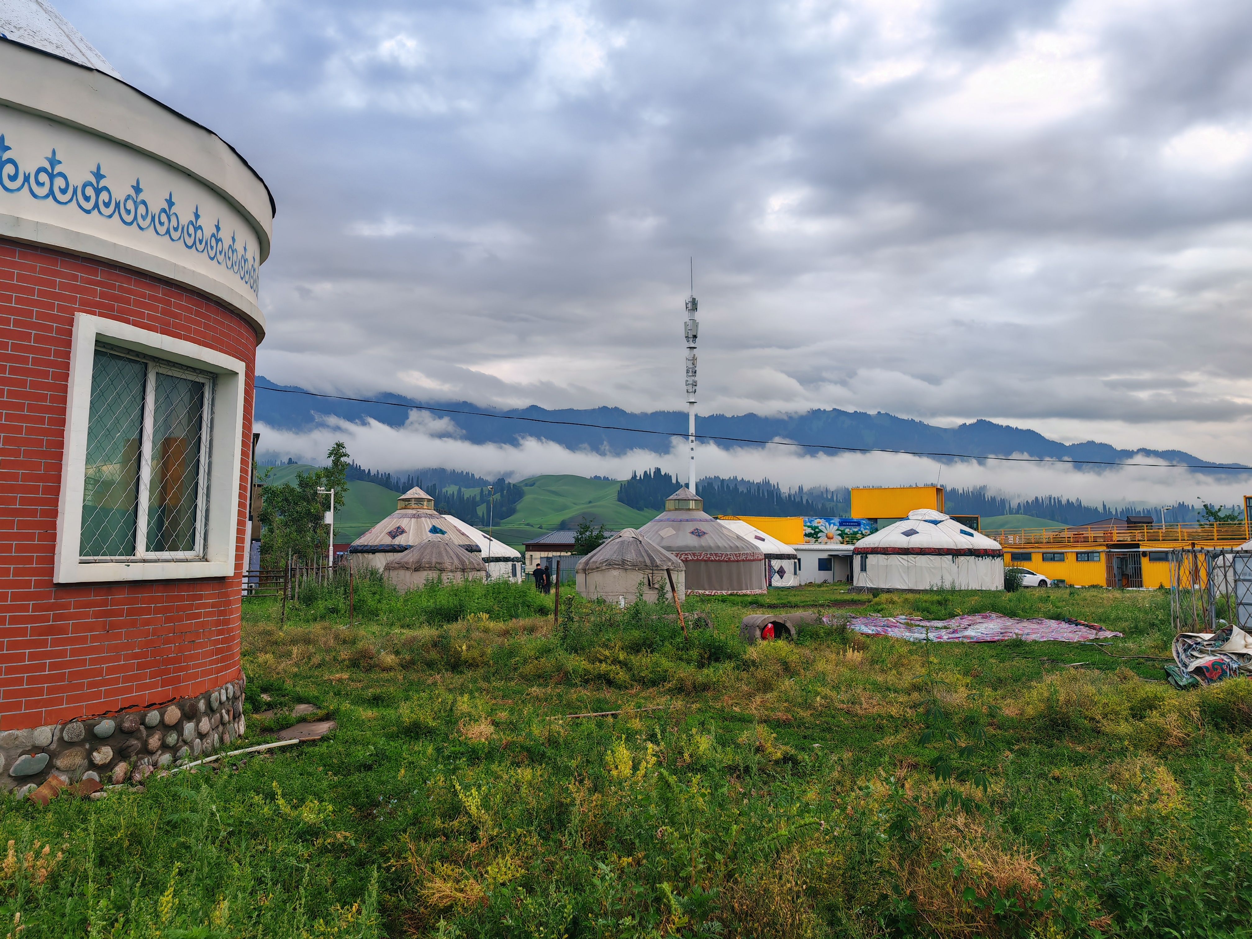 28日早上女同胞们8点起来烧水煮面,昨天剩下汤和羊肉热了浇到碗里,味道加持感觉不错。村子里蓝色黄色的房子,白色毡包,星罗棋布,村子对面是宽阔的草地、河流,稍远处的山上云雾缭绕,有几只鹰和稍小一点的鸟在空中盘旋,偶尔有几声鸟鸣更显青幽恬静。