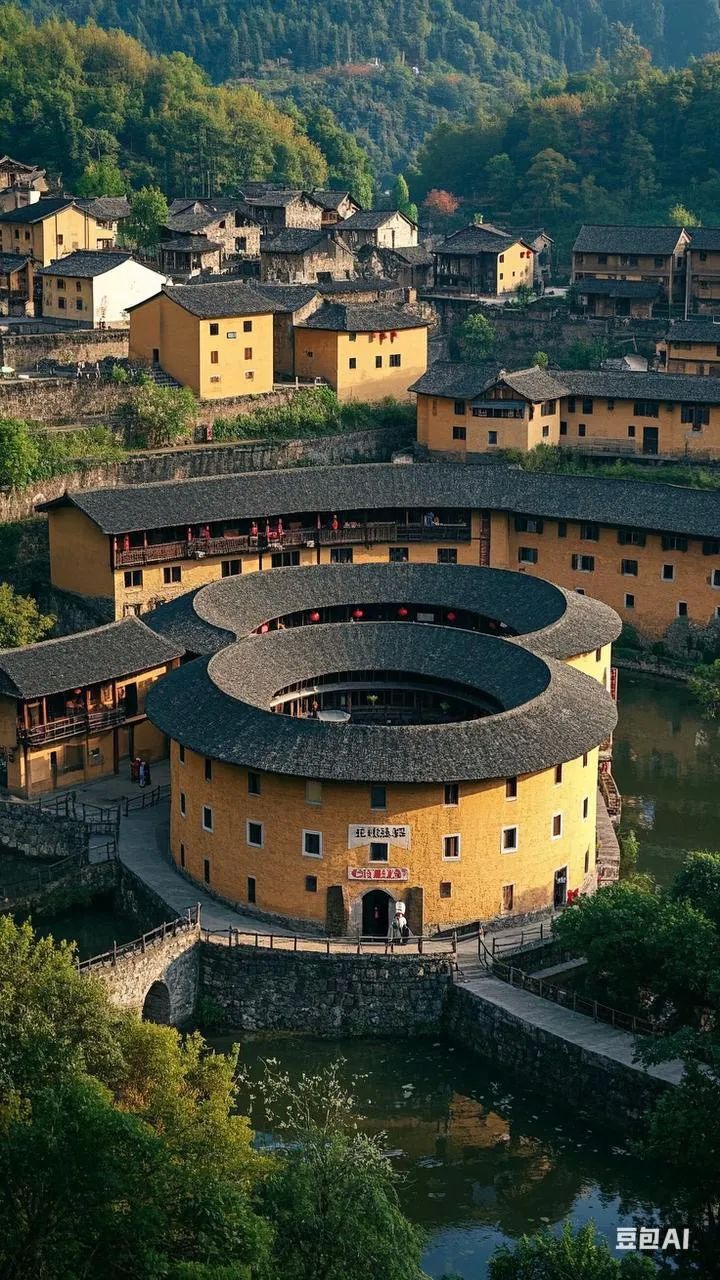 * **田螺坑土楼群:** “四菜一汤”是南靖土楼的标志性景观,五座土楼依山而建,错落有致,宛如一幅山水画。