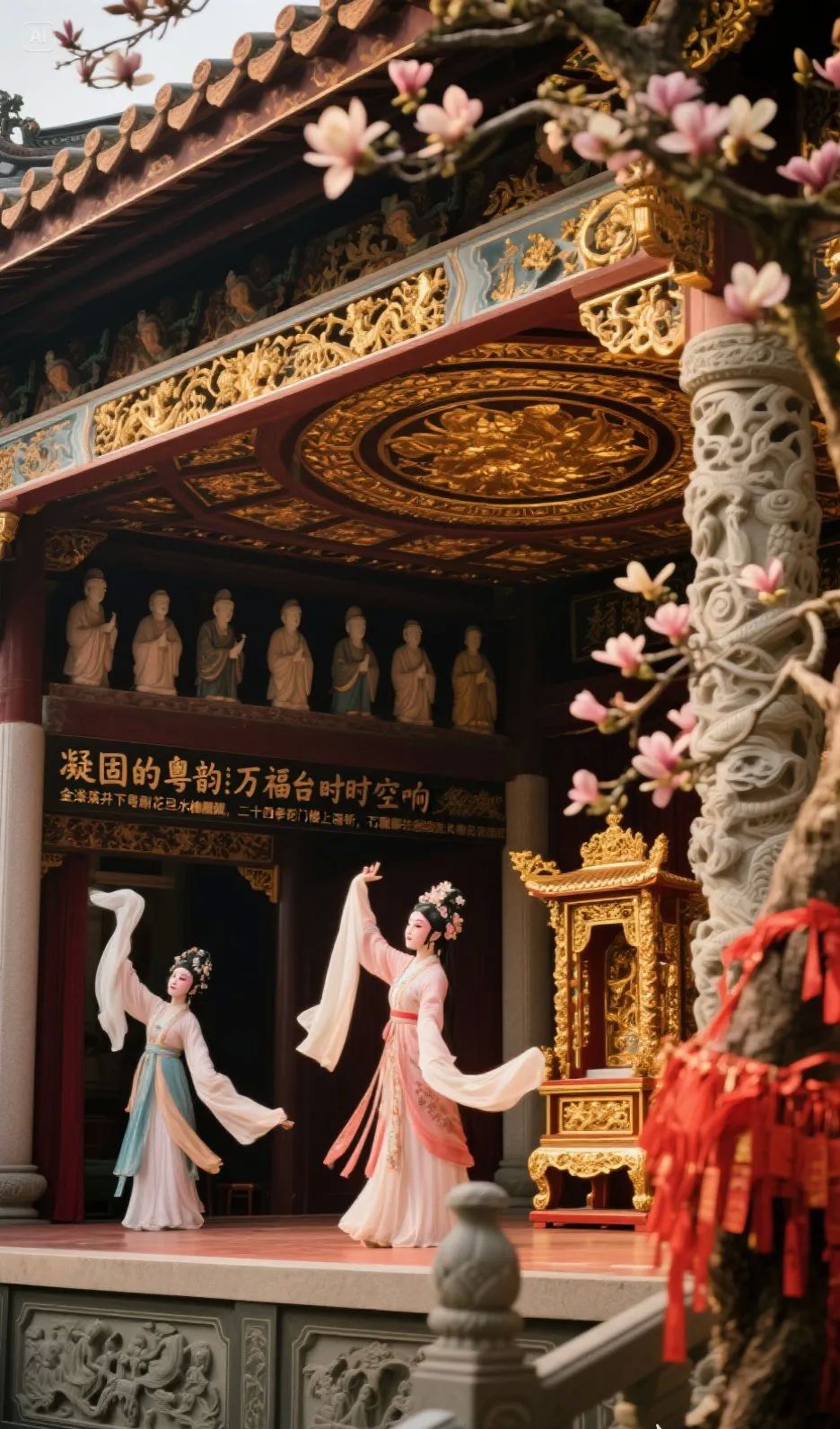 万福台的藻井如倒悬的莲花,金漆木雕在晨光里流淌蜜色。戏台上水袖翻飞的伶人正唱着《帝女花》,粤韵袅袅间,垂花门楼上的二十四孝陶塑群像仿佛也在侧耳倾听。那些骑麒麟的状元郎、驾祥云的八仙,凝固的釉彩里藏着无数个市井传奇。