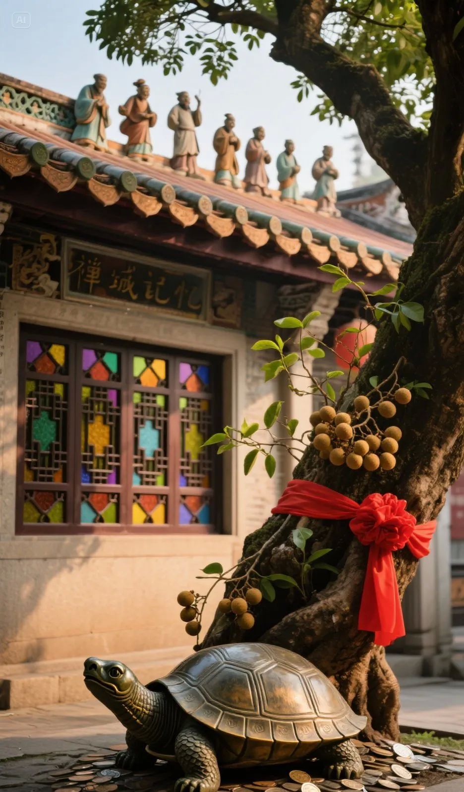 灵应祠的北帝铜像端坐于漆金神龛,三缕长须垂落蟒袍,香火如淡青绸缎缠绕在十二扇镂空木雕屏风间。跪拜的老妪将许愿笺系上百年龙眼树,红绸拂过龟裂的树皮,竟比新抽的嫩芽更鲜亮。锦香池畔孩童掷下铜钱,涟漪惊醒了石雕龟背上的硬币森林,青铜龟首依然吞吐着八百年的祈愿。