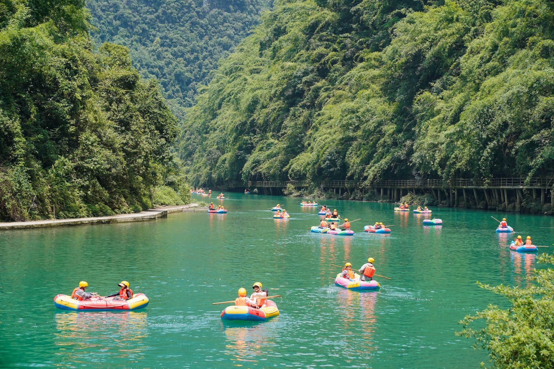 阿依河漂流体验分两段太懂了!上半段“碧潭戏水”4km简直是亲子党的天堂,水流缓得能在筏子上吃零食,跟朋友拿水枪互喷全身湿透也超解压,划累了就漂着看两岸青山,阳光洒水面上亮晶晶的,随手一拍都是大片。下半段“浪遏飞舟”9km直接切换过山车模式,皮筏在激流里左摇右晃,抓紧安全绳尖叫到破音,那瞬间感觉所有烦恼都被甩进乌江了,这刺激感玩一次记一辈子!