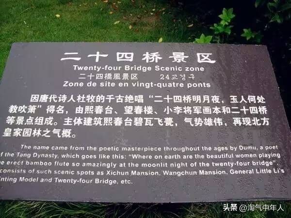 因唐代诗人杜牧的千古绝唱“二十四桥明月夜,玉人何处教吹笛。”等景点组成。主体建筑熙春台碧瓦飞甍,气势雄伟,再现北方教吹箫”得名,由熙春台、望春楼、小李将军画本和二十四桥,皇家园林之气概。