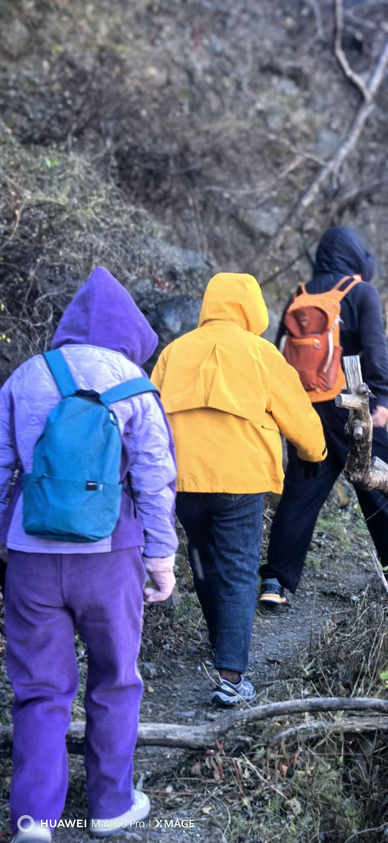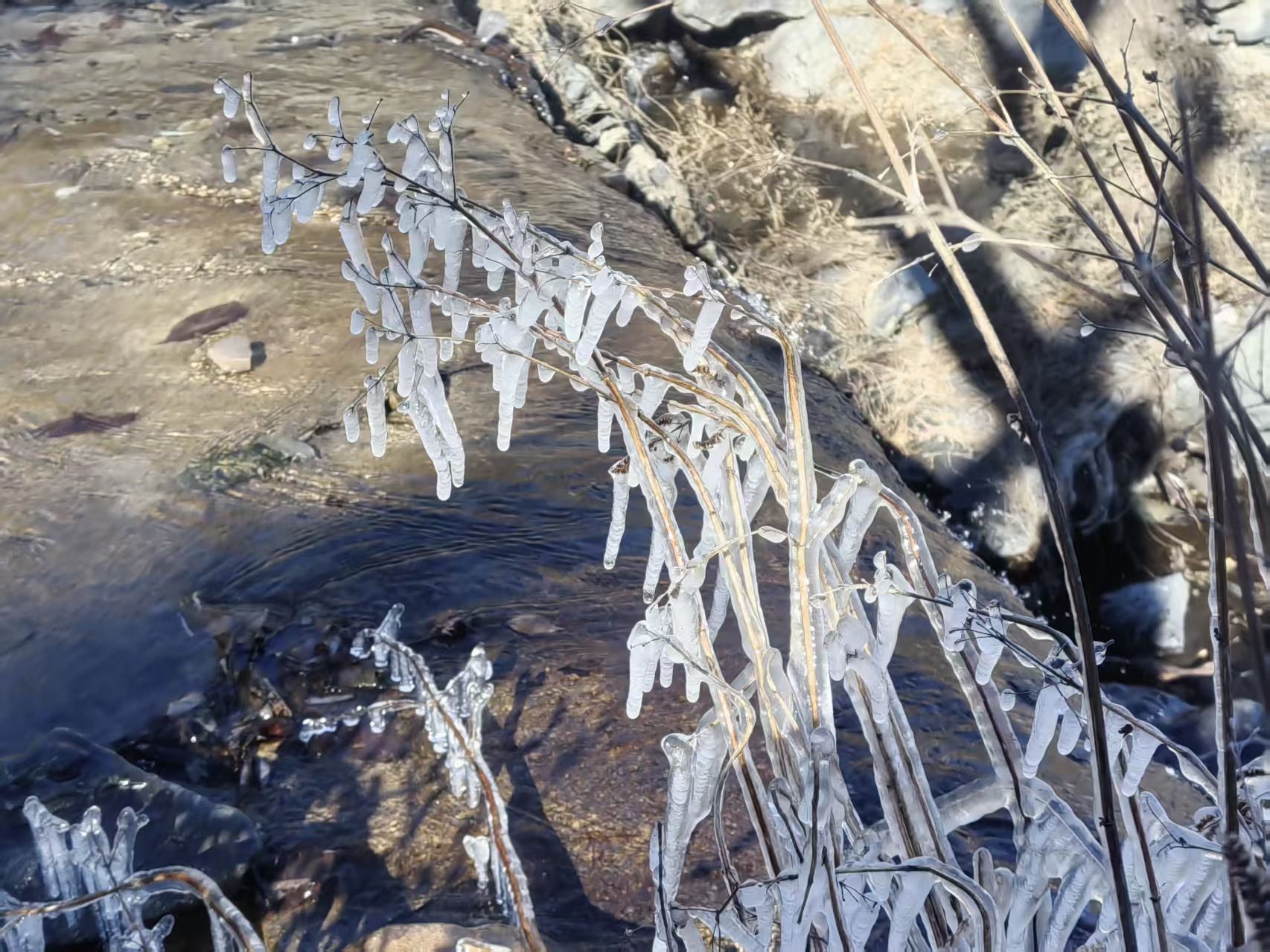 在茶棚稍作休整,我们沿着溪流开始下山。山里气温更低,不少溪流地段已结了薄冰,崖壁上、枝丫间随处可见晶莹的小冰挂,像一串串透明的珍珠,又似一朵朵冰凝的花朵,在斑驳的光影下闪着微光,美得让人挪不开眼。