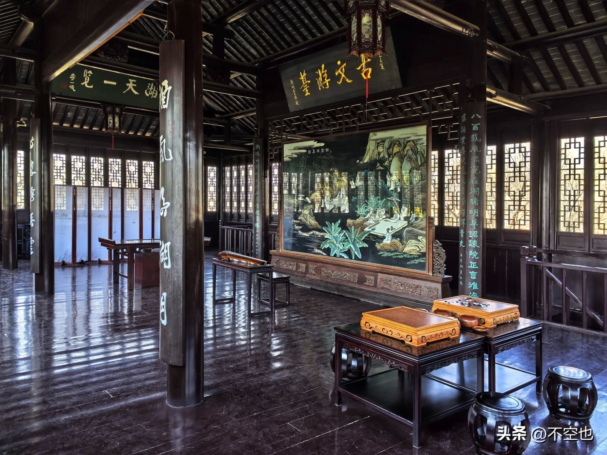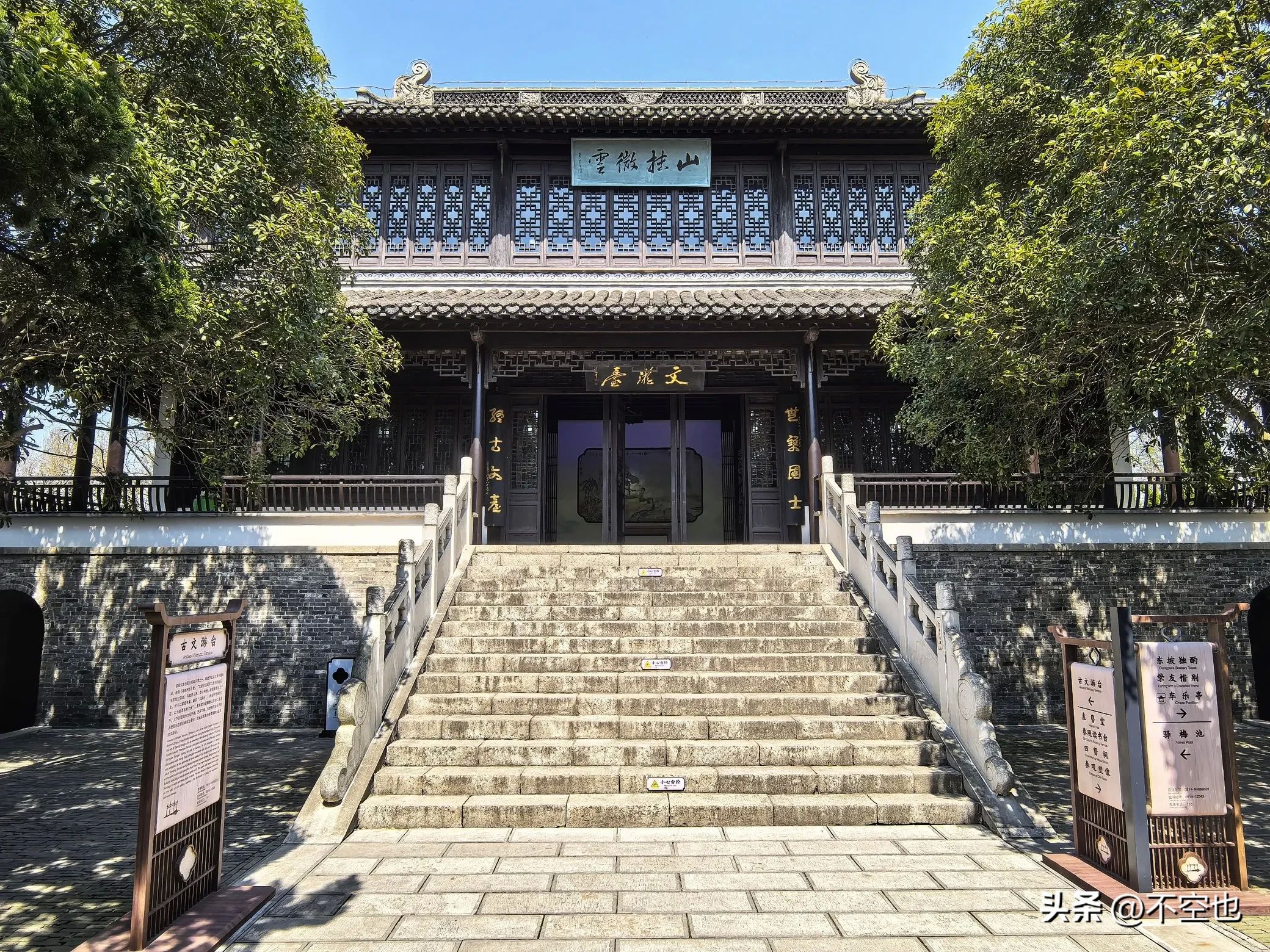 铜像的东侧是客集堂,西侧为秦观纪念馆。铜像背后,高耸的文游台似乎在默默地守护着这位高邮的历史名人。说是高台,其实也不过十多米,白墙灰瓦、褐色梁柱,门厅悬挂“淮堧名胜”匾额,内部瓷壁画《四贤聚会》及《西园雅集图》刻漆屏风,展现了宋代文人的风雅生活。