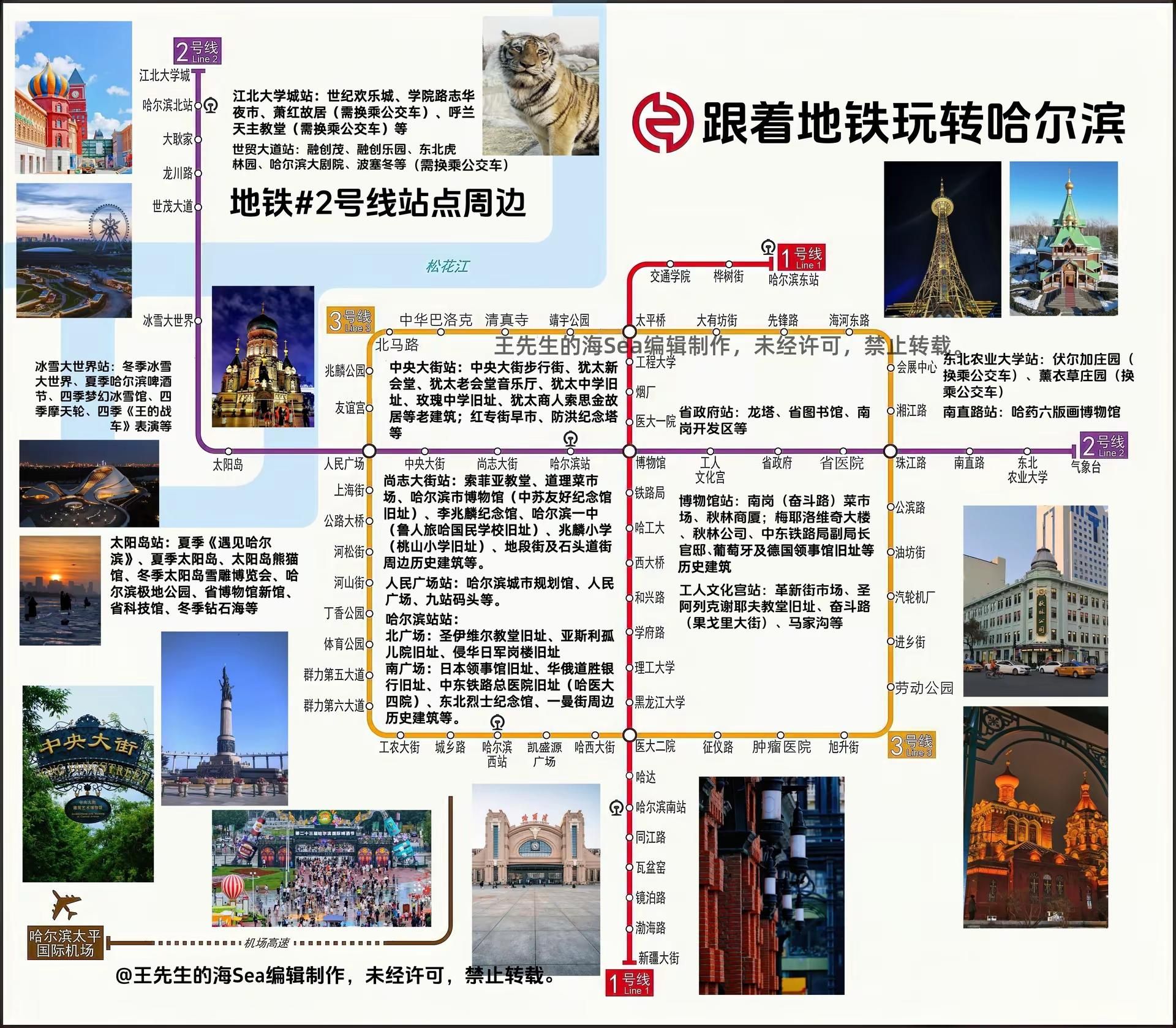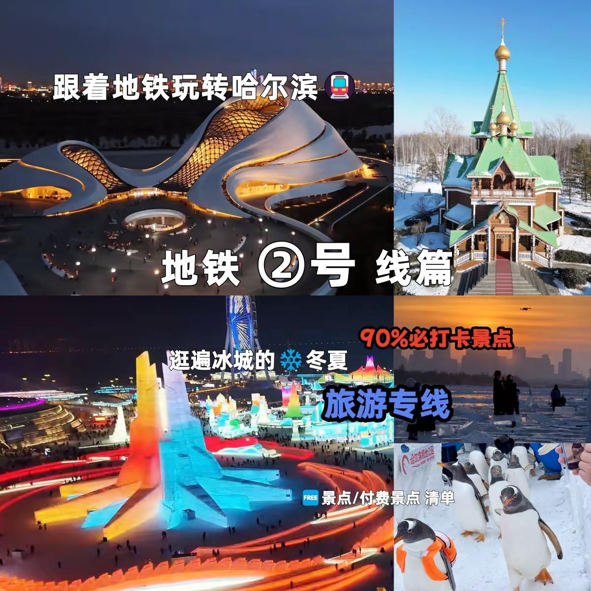 解锁哈尔滨最快玩法 地铁串联核心景区清单。#保姆级攻略#一站式游玩#哈尔滨#哈尔滨旅游攻略#哈尔滨自由行 付费景点东北农业大学站:伏尔加庄园(成高子真)、薰衣草庄园(东方红农场)省政府站:龙塔(长江路178号)尚志大街站:索菲亚教堂室内(透龙街88号)哈尔滨冰雪大世站:梦幻冰雪馆、摩天轮等 雪景路1666号 太阳岛站:极地公园、太阳岛冬季雪雕节、太阳岛夏季遇见哈尔滨、太阳岛熊猫馆世贸大道站:波塞冬(汇江路153号)、融创乐园(世贸大道99-1号)、东北虎林园(松北街88号) 博物馆纪念馆南直路站:哈药六版画博物馆(南直路326号)中央大街站:犹太新会堂(犹太人历史文化博物馆)经纬街162号、犹太老会堂(音乐厅)通江街82号、犹太商人索思金故居 经纬四道街30号、哈尔滨市博物馆 柳树街13号 人民广场站:哈尔滨城市规划馆 友谊路369号哈尔滨站站(哈尔滨站南广场):安重根纪念馆 哈站南广场进站大厅西侧、东北烈士纪念馆 一曼街241号 太阳岛站:黑龙江省科技馆 太阳大道1458号、黑龙江省博物馆(新馆,暂未开馆) 松北天马街江北大学城站:呼兰萧红故居 萧红大道226号 历史建筑游览省博物馆站:红军街、颐园街、阿什河街、果戈里大街、东大直街、西大直街周边历史建筑 工人文化宫站:圣阿列克谢耶夫教堂 士课街与革新街交口 中央大街站:中央大街步行街 中央大街1号、防洪纪念塔 友谊路259号、玫瑰中学旧址(中东铁路竞技俱乐部)上游街69号 尚志大街站:索菲亚广场 透龙街88号、哈尔滨市第一中学(鲁人旅哈国民学校旧址)兆麟街121号、兆麟小学(桃山小学)地段街198号 哈尔滨站站:北广场:圣伊维尔教堂、亚斯利孤儿院旧址 哈尔滨站北广场内、侵华日军岗楼旧址 道理警校胡同 南广场:中东铁路总医院旧址(哈医大四院)颐园街37号、龙门大厦贵宾楼旧址、日本领事馆旧址等 江北大学城站:呼兰天主教堂 呼兰亿兴街与东府路交口 烟火气体验(可手机导航):省博物馆站:南岗(奋斗副食)菜市场 建设街92号、秋林公司 东大直街319号工人文化宫站:革新街市场中央大街站:红专街早市尚志大街站:道理菜市场江北大学城站:学院路志华夜市 冰雪及自然体验太阳岛夏季免费、冰雪大世界夏季啤酒节免费入场、钻石海世贸大道站:哈尔滨大剧