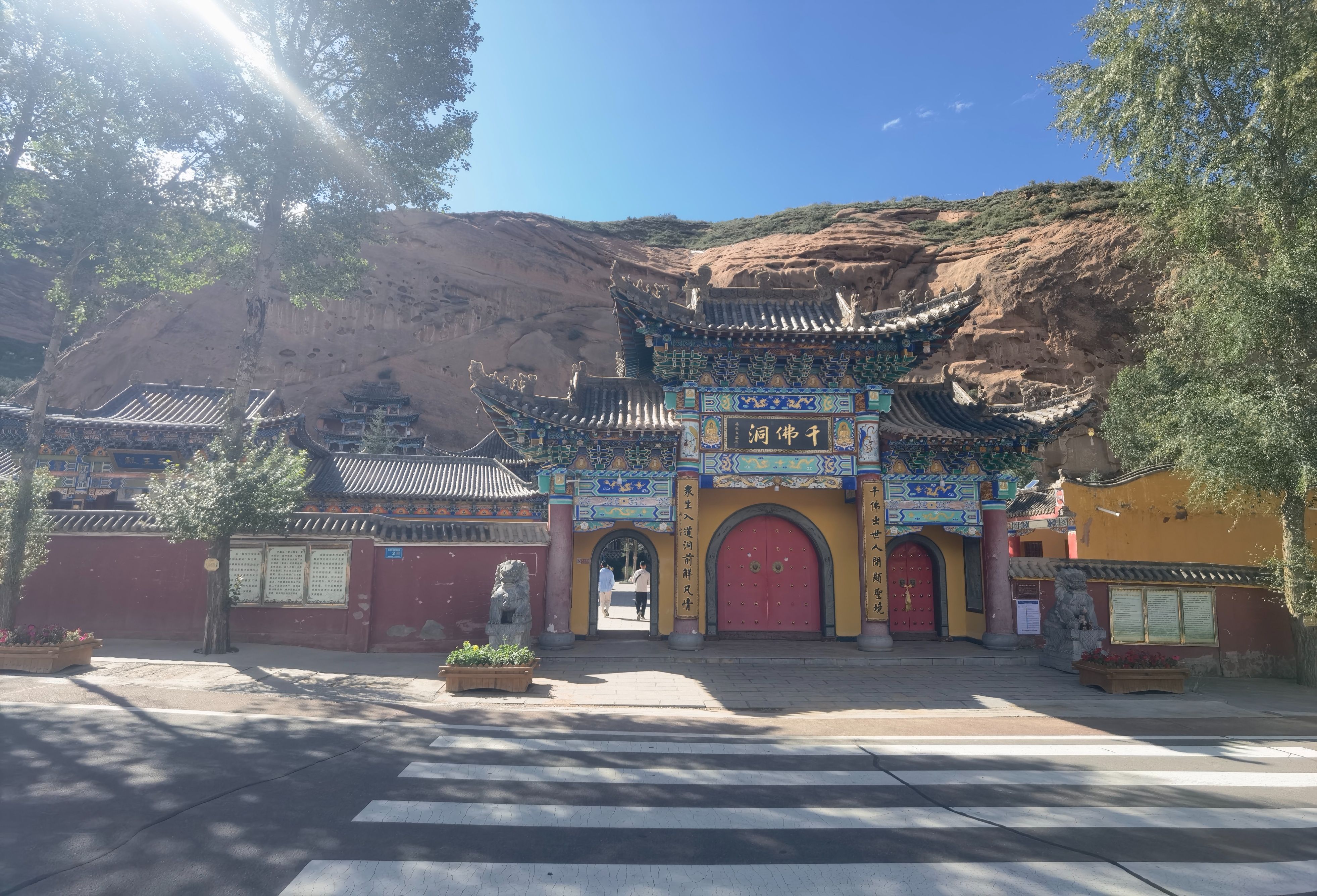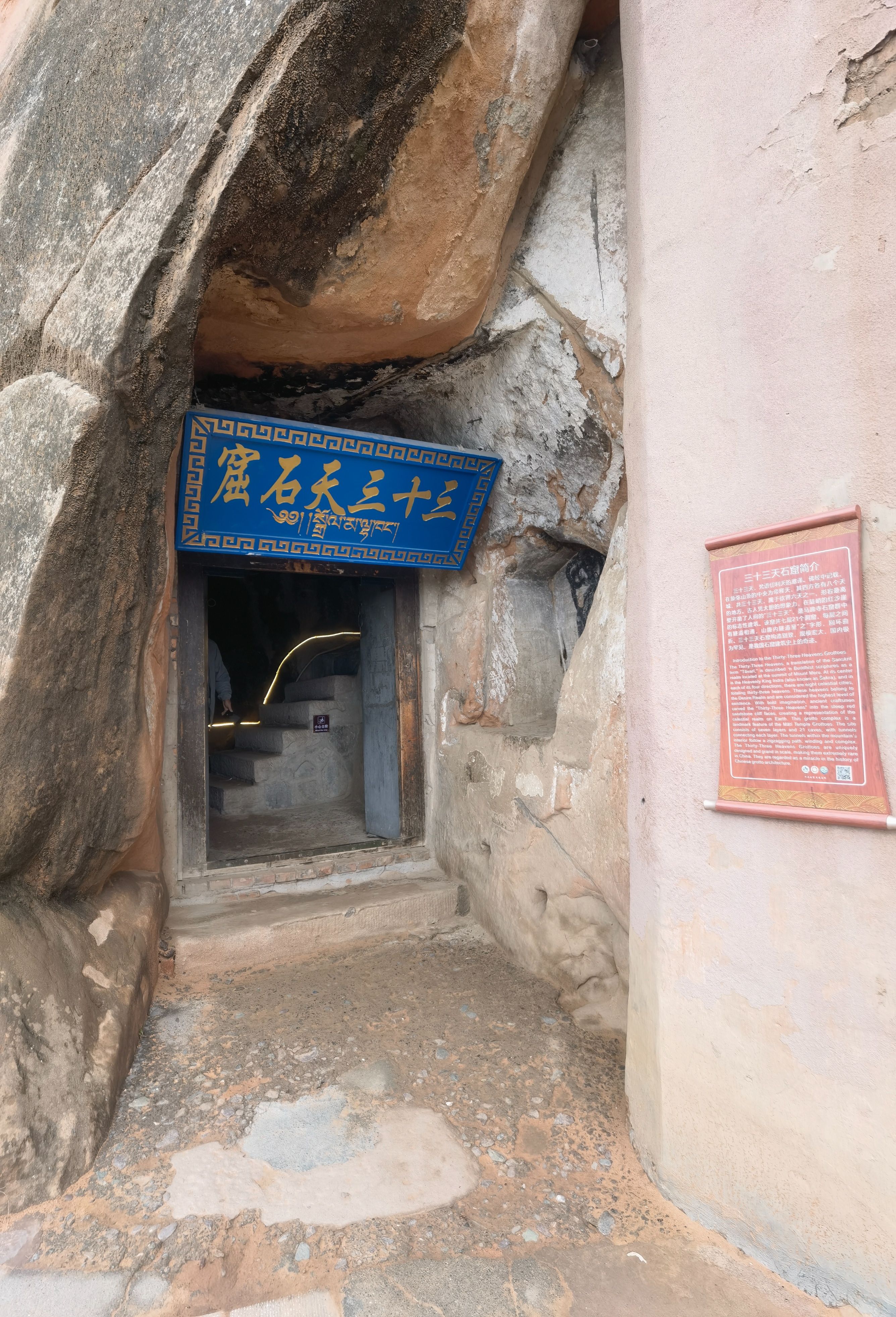 7月5日(周六,出行第二十七天),早晨天气凉爽,我们按计划上午前往民乐县,在县城边看到一“古塔”,停车走进寺庙,原来是“圣天寺”,寺庙正在修缮,没有游人,我们转了一圈儿就走了。当我们驾车走在林荫小道,偶然发现远处的高山隐隐的雪山,看到路边大片的油菜花时,很多人停车拍照,我们也停车加入欣赏美景的队伍,中午就来到了“马蹄寺景区”(国家4A景区,门票74元,60岁半价优惠),景区停车场很大,经过一段坡道,两侧都是商铺(纪念品、食品、小吃),就来到游客中心购票,进入景区大门乘坐观光车(往返13元)可去三个景点。下车走了800米看到了“马蹄寺石窟群″,一下子把我们“震撼”到了,来之前我们原以为只是一座藏传佛教的寺庙,没想到是精美的石窟,与山西“悬空寺”不同,先人们的智慧才智与能工巧匠打造而来,眼前看到一个绝壁上修建了几处寺庙,看到上边有人在走动,我也好奇地想上去一探究竟。我跟随着参观人流,一个一个的攀爬、钻洞,最为经典的是“三十三天石窟”,庙与庙之间是在山体里掏挖的梯子,有的直上直下,有的只能一人通过,虽然感觉有些“惊险刺激”,但更多地是内心里佩服这一奇迹般的“创举”,在路边还看到一只硕大的“土拨鼠”等待游人的喂食,我们乘坐观光车继续游览千佛寺、格萨尔王殿等两个景点,然后乘坐观光车返回停车场就离开景区了。几天下来,脑海里还时常回荡着攀爬“三十三天石窟”场景。隆重建议只要来张掖的朋友,千万不要错过“马蹄寺”。