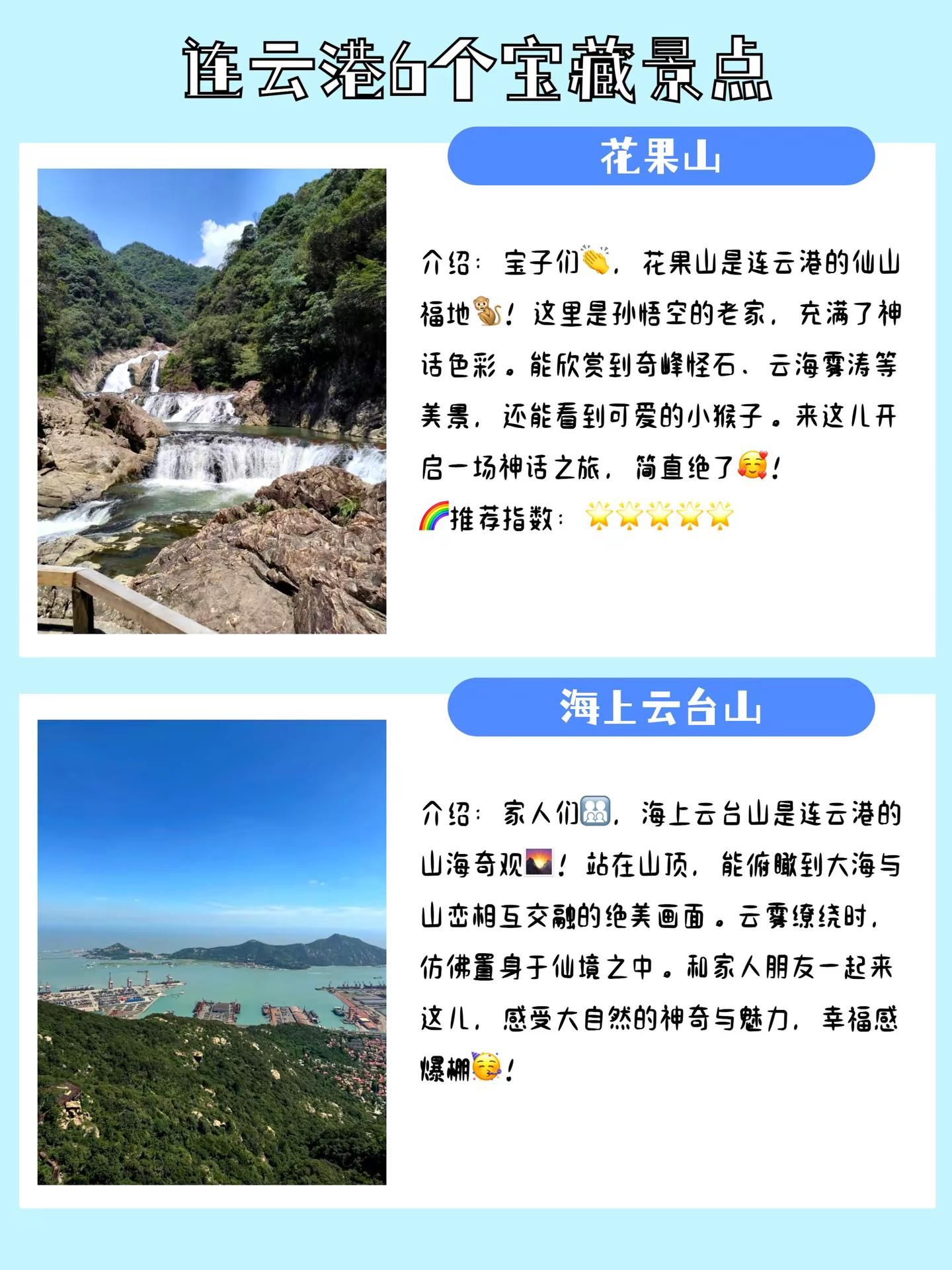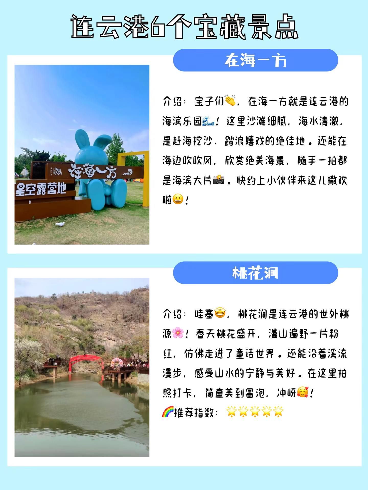 江苏连云港旅游必去的6个宝藏景点推荐。连云港是一座山海相拥的旅游城市,西游文化的发源地,在这里追寻大圣的足迹,还能大饱口福,享受价廉物美的海鲜盛宴。整理推荐6个来连云港旅游必打卡的景点,有需要的宝子码住收藏~~~【在海一方】介绍:连云港的“滨海休闲乐园”来啦!在海一方沙滩柔软,海风轻拂超惬意,和家人一起踏浪、堆沙堡,或者拍张“海滨小玩家”照,你就是朋友圈的“海滨欢乐小达人”!推荐指数:游玩亮点:沙滩柔软、海风惬意、海滨小玩家打卡 【桃花涧】介绍:连云港的“粉嫩桃花秘境”上线!桃花涧桃花盛开,粉嫩如霞超浪漫,和恋人一起漫步、赏桃花,或者拍张“桃花小情侣”照,你就是朋友圈的“浪漫小主角”!推荐指数:游玩亮点:桃花盛开、粉嫩如霞、桃花小情侣打卡 【月牙岛】介绍:连云港的“月牙形梦幻岛”来啦!月牙岛形状独特,湖水清澈超宁静,和好友一起骑行、看日落,或者拍张“月牙小旅人”照,你就是朋友圈的“宁静小达人”!推荐指数:游玩亮点:月牙形状、湖水清澈、月牙小旅人打卡 【连岛】介绍:连云港的“海岛度假天堂”上线!连岛海岛风光美,海水清澈超嗨皮,和度假搭子一起游泳、晒太阳,或者拍张“海岛度假小达人”照,你就是朋友圈的“度假小明星”!推荐指数:游玩亮点:海岛风光美、海水清澈、海岛度假小达人打卡 【花果山】介绍:连云港的“齐天大圣老家”来啦!花果山猴子机灵,传说神秘超有趣,和娃一起看猴子、探秘境,或者拍张“花果小粉丝”照,你就是朋友圈的“神话小探险家”!推荐指数:游玩亮点:猴子机灵、传说神秘、花果小粉丝打卡 【海上云台山】介绍:连云港的“海上仙山奇境”上线!海上云台山云雾缭绕,山海相依超震撼,和摄影小伙伴一起登山、拍云海,或者感受那份仙山的缥缈与神秘,你就是朋友圈的“仙山小摄影师”!推荐指数:游玩亮点:云雾缭绕、山海相依、仙山小摄影师打卡#连云港旅游 #连云港旅游景点 #连云港必去景点 #连云港旅游推荐官