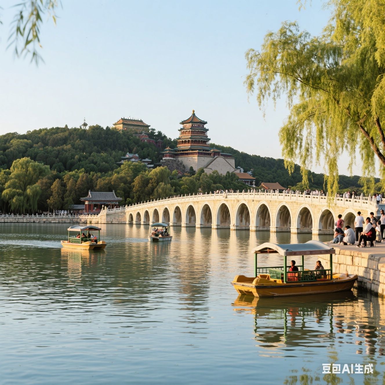• 上午:9:00左右到达颐和园,从新建宫门进,依次参观铜牛、十七孔桥,乘船至石舫,再经过长廊到达佛香阁,最后从东宫门出。
