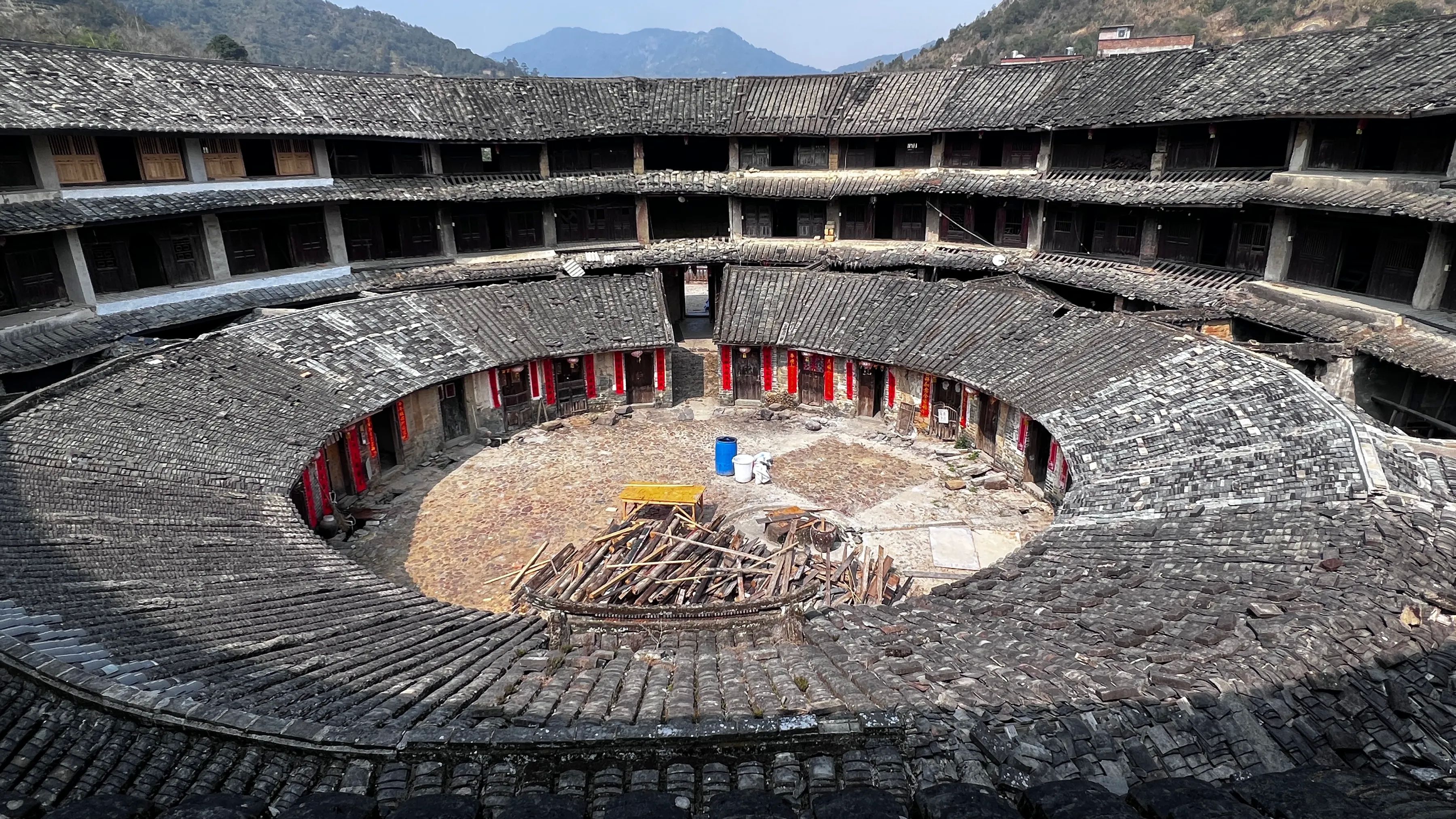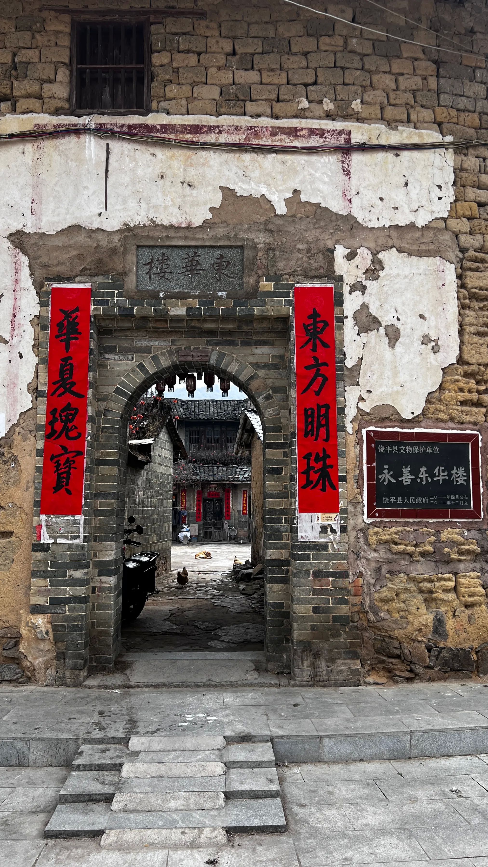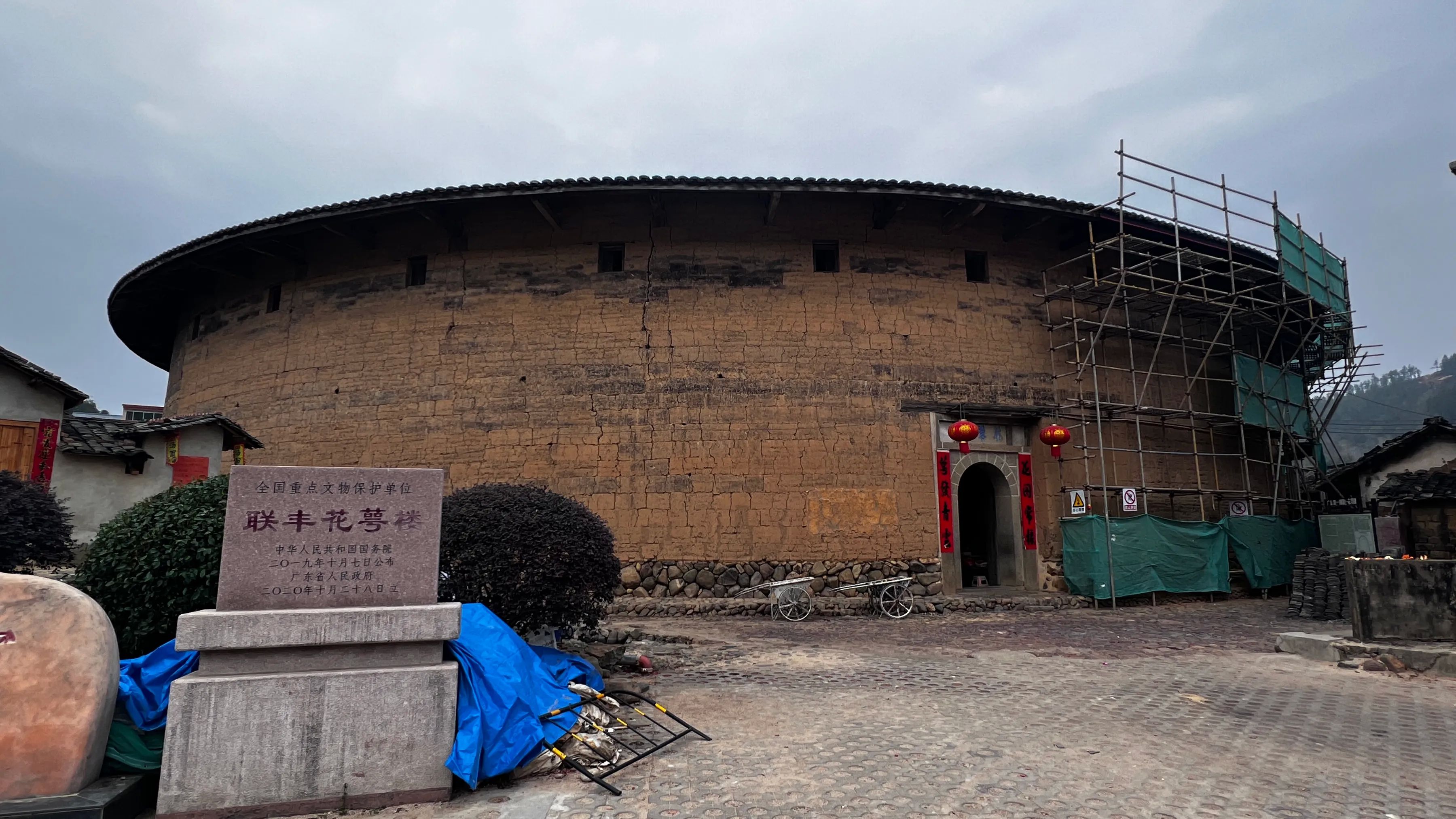 导航,停在福海楼,荒废中,无人居住。出门往左走几步,就到了东华楼。二进围屋,是新中国成立初期土楼建筑的典型代表。瓦屋上长满了花草,楼里仍居住着2户人家3个80多岁的老人,不愿离去。继续往左走,就到了南阳楼。南阳楼,距今有600多年历史,列为省保单位,三级财政拨款200万元,进行修缮,已有1年多时间,仍在进行中。