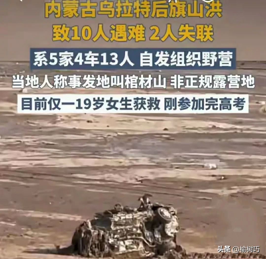 上周六晚上,在内蒙古乌拉特后旗出了令人惋惜的事故,五个家庭十多口人在野外露营,结果突遇山洪都被冲走了。