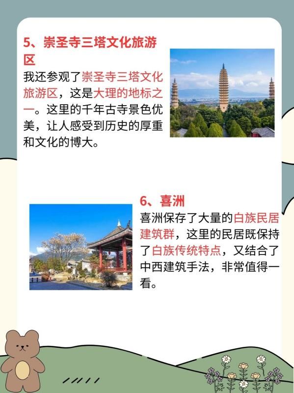 - 特色:包括南诏风情园、大理白族三塔和崇圣寺三塔,是大理的地标性建筑,每座塔都有其独特的历史和文化故事。