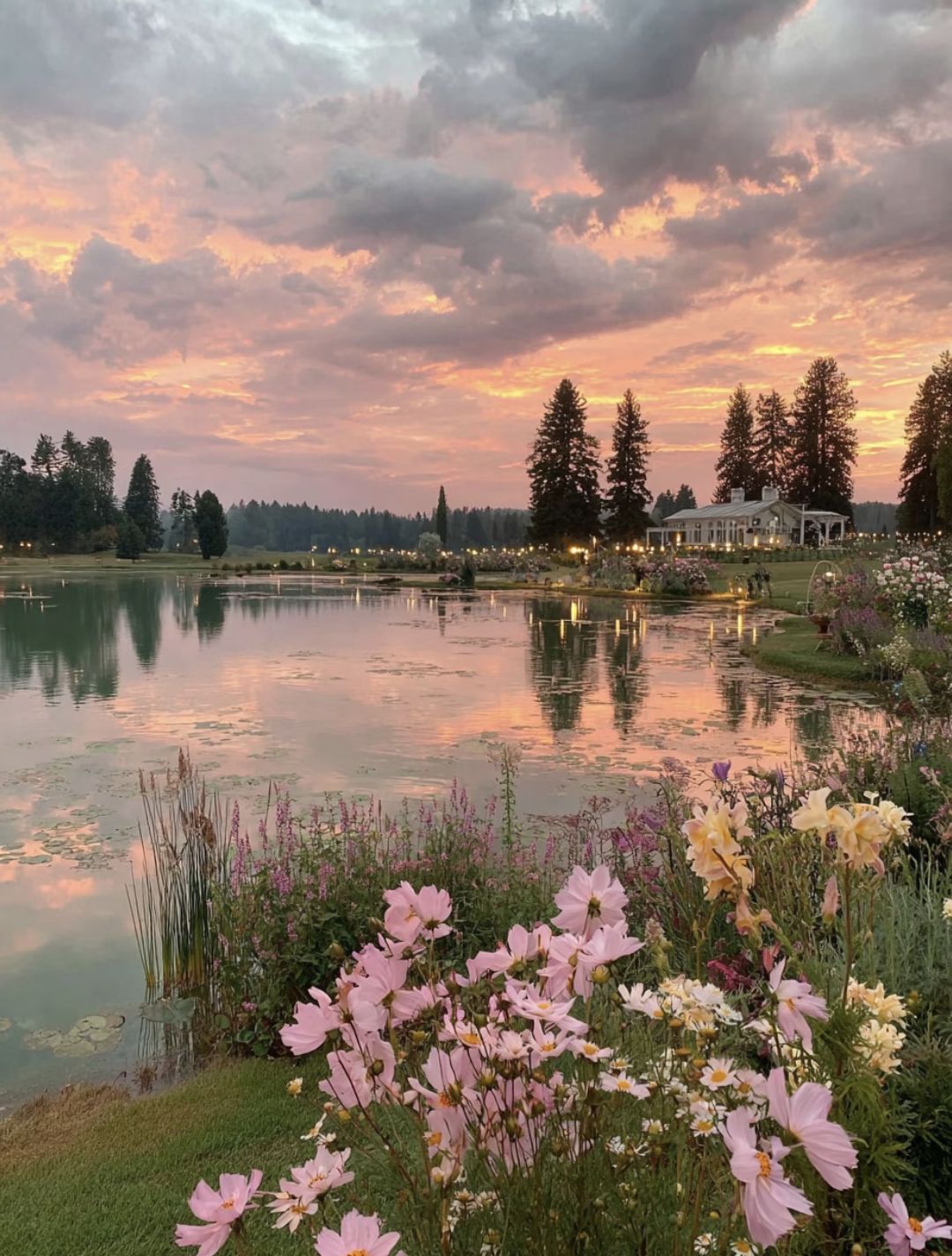 天上的云,被夕阳染上了颜料。靠近太阳的是暖橘色,稍远一些是粉紫色,再往上,则融进了淡淡的蓝灰色调子里。这些色彩,毫无保留地倒映在湖中。于是,天与水的界限模糊了,你仿佛看着两个平行的世界,一个在天上,一个在水里,同样盛大,同样安宁。