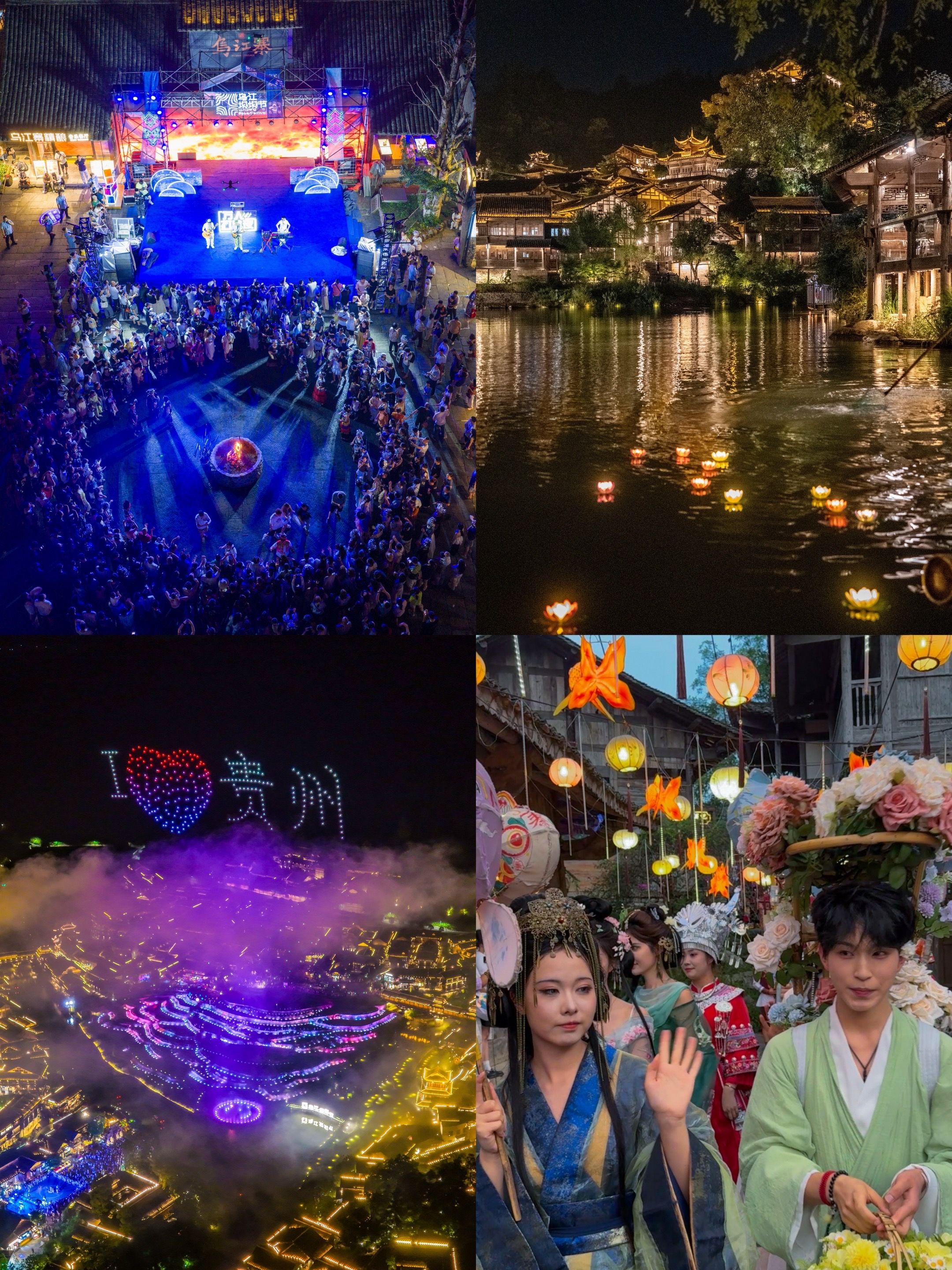 夜游必冲:摇橹船划过灯影江面+民俗闹街巡游(民俗文化体验直接拉满)+火壶火舞秀(火壶不仅有“火树银花”的美丽,更有“百家安宁”的祝福!手机拍不出十分之一震撼!)+万人打跳夜,夜景美到失语~
