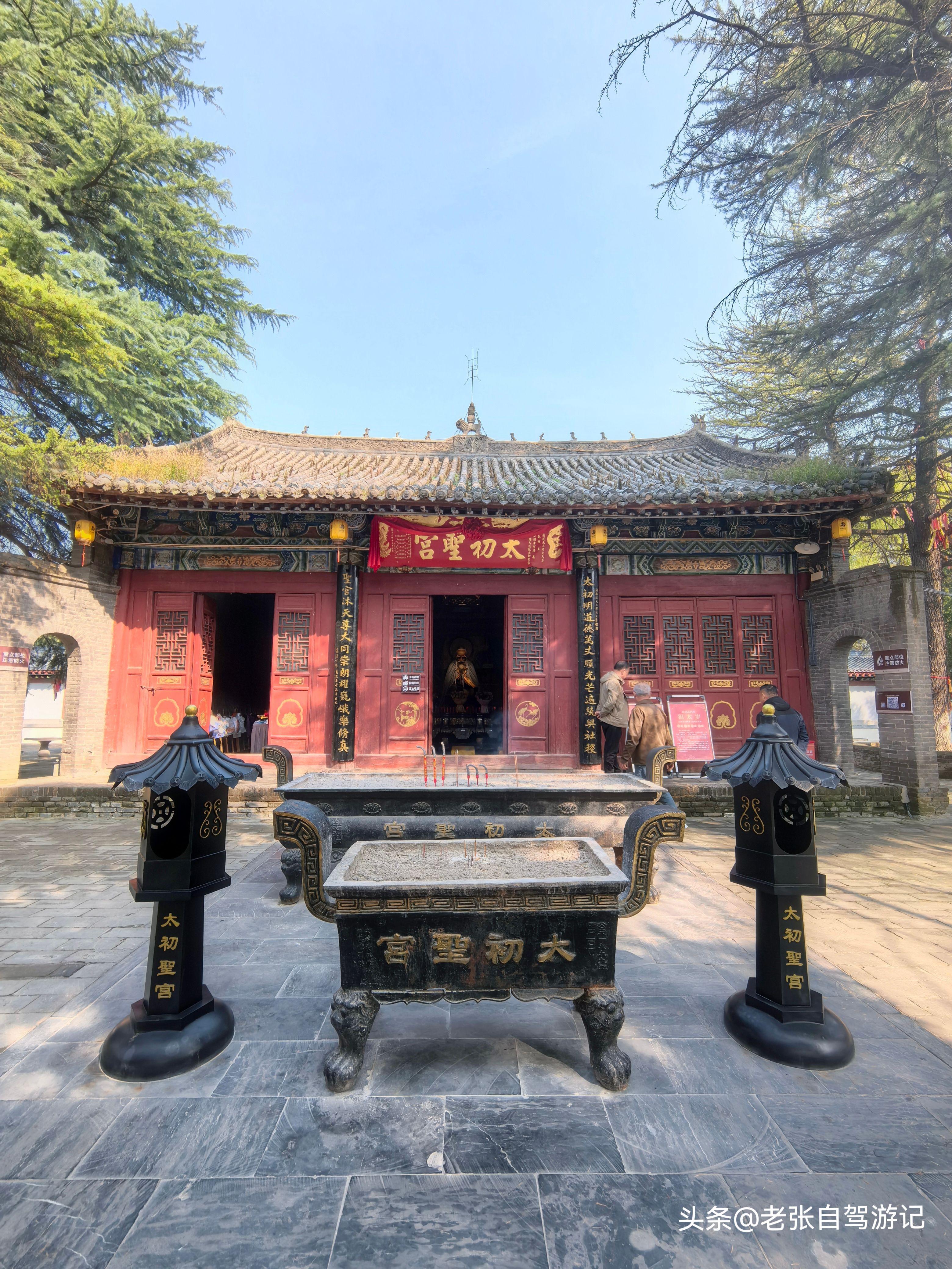 图6,灵石的旁边,就是这座太初圣宫,曾经是老子居住并著书的地方,唐朝时为了纪念老子,在这里建造了太初圣宫,之后历经多少朝代,不断被翻新修缮,如今依然富丽堂皇。