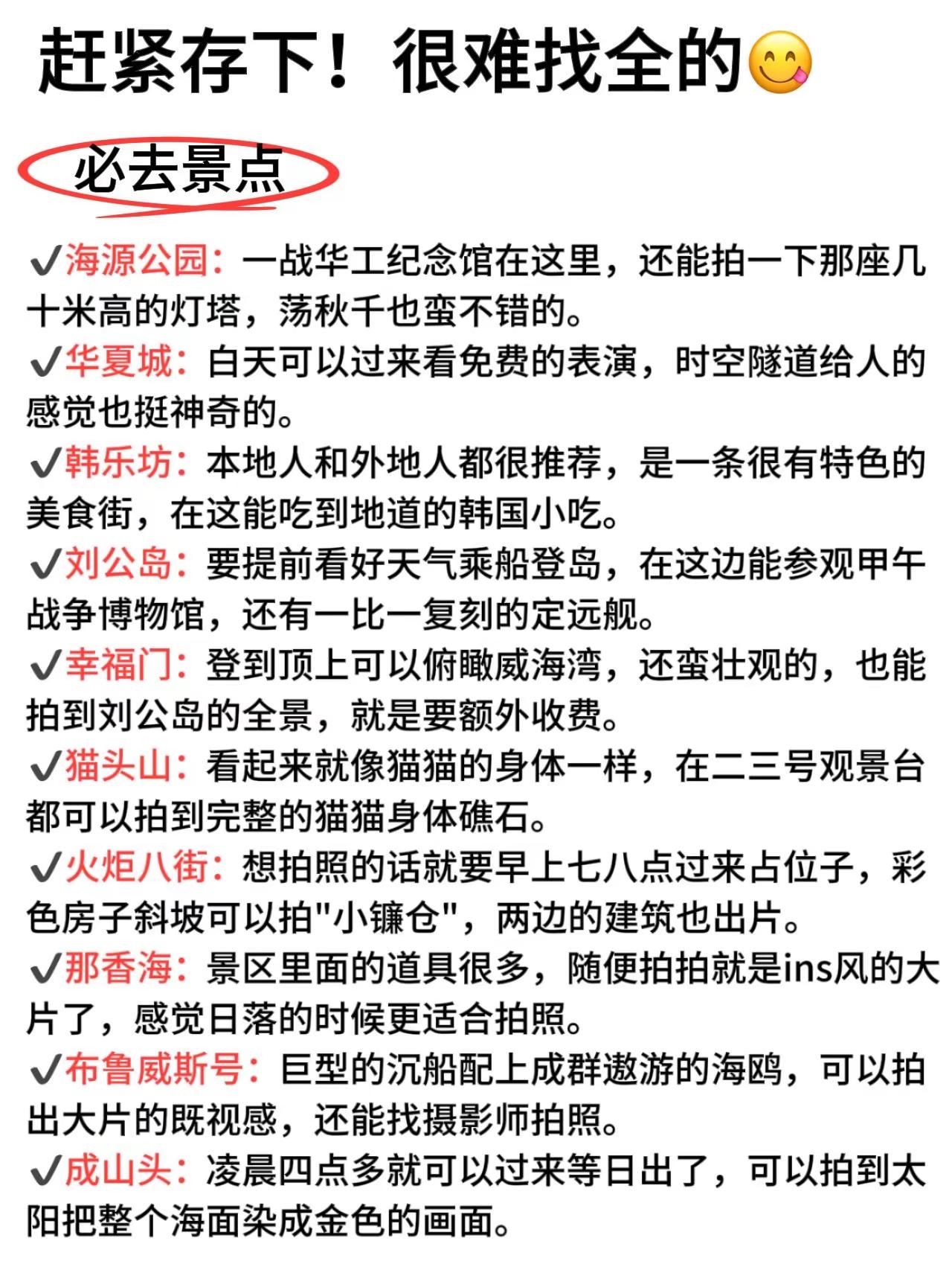 去威海前,还是听点大实话吧。。。。刷了无数篇威海旅游攻略,发现每个人对威海的看法都不一样,玩法也有区别,根据我的个人经验整理了一份攻略都是我的真实体验,建议收好~-威海建议去的景点威海公园:标志性的大相框是必拍的打卡点,能拍到海天一色的美景。刘公岛:里面有甲午战争博物馆和炮台,是一个很有历史意义的地方。半月湾沙滩:这个季节的半月湾逛起来很舒服,还能看到很美的日出。猫头山:从高处往下俯瞰的美景真的绝了,远处看过去就跟猫猫的身体一样。金海湾栈桥:站在栈桥上拍照真的很有氛围,白天可以看海傍晚看日落也很美。火炬八街:虽然毕竟商业化但完全不影响它的美,站在街头还能看到大海。小石岛:是一个赶海的好地方,能带着小桶过来挖小螃蟹和贝壳。那香海:蓝天白云大海的怎么拍照都好看,沙滩踩起来软软的很舒服。鸡鸣岛:要坐船才能上岛去观赏,风景很美还能看到蓝蓝的大海。布鲁维斯号:沉船配上海鸥拍照真的巨出片,不同角度拍出来都会不一样。神雕山动物园:是一个很大的动物园,动物也多,尤其是大熊猫真的太可爱了。成头山:如果不赶时间的话可以看日出,还能走到头去打卡山尽头立碑。#山东威海 #威海旅游攻略 #威海旅行 #威海美食 #威海网红打卡地