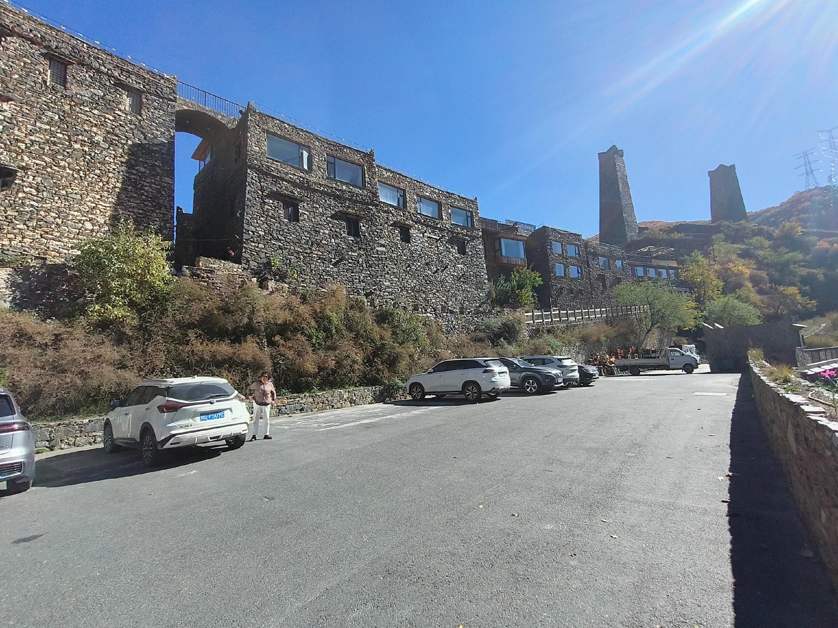 从548国道拐到317国道往东一点,就到了马尔康市松岗镇的“柯盘天街”。这个柯盘天街是古人建设在山顶上的一个碉堡型住宅,可以俯瞰松岗镇全貌。现在被改为天街了,里面很多民宿和商店。