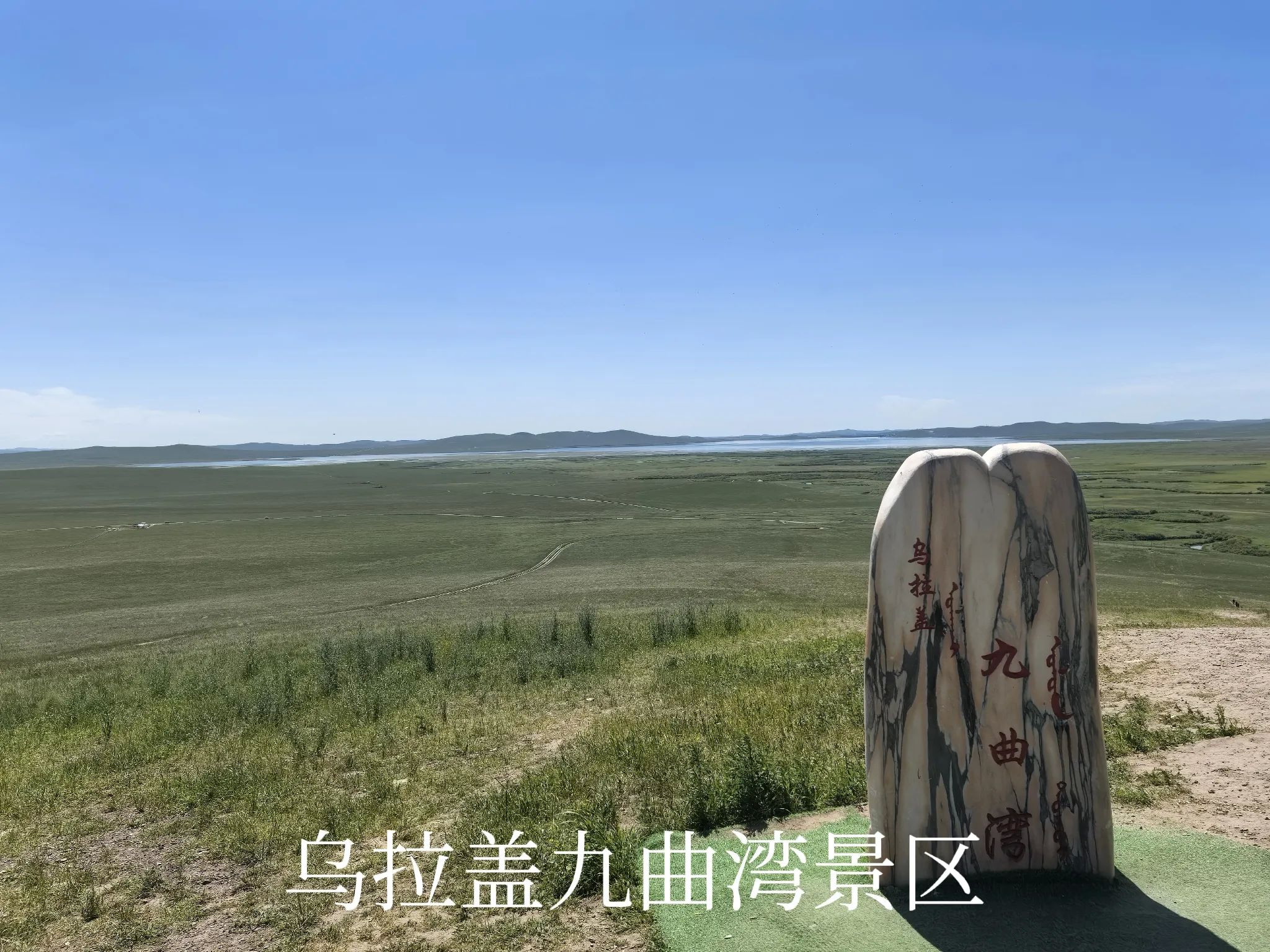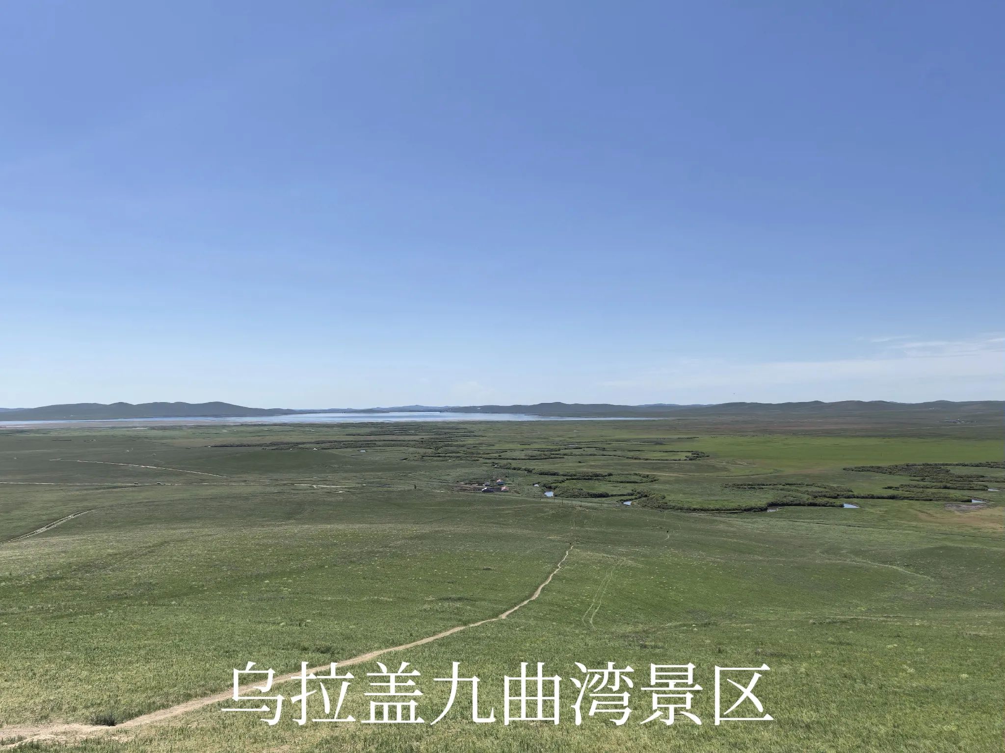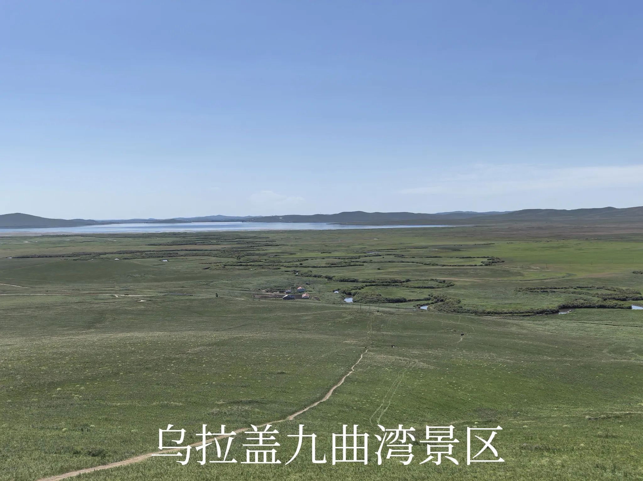 其实乌拉盖河(乌拉盖湖的水源来水),在草原谷地全是弯弯曲曲的样貌,何止九曲十八弯!九曲湾景区开发相对较早,有了些名气,实际上游客在观景平台上,除了下过连续暴雨后的涨水期,其实是看不到景区宣传片中所展示的美景的。当然,可以乘景区的直升机或动力伞到空中去,俯瞰乌拉盖河,估计景色会不错。但有这种胆量且愿意再多花不少银子的人毕竟是少数。