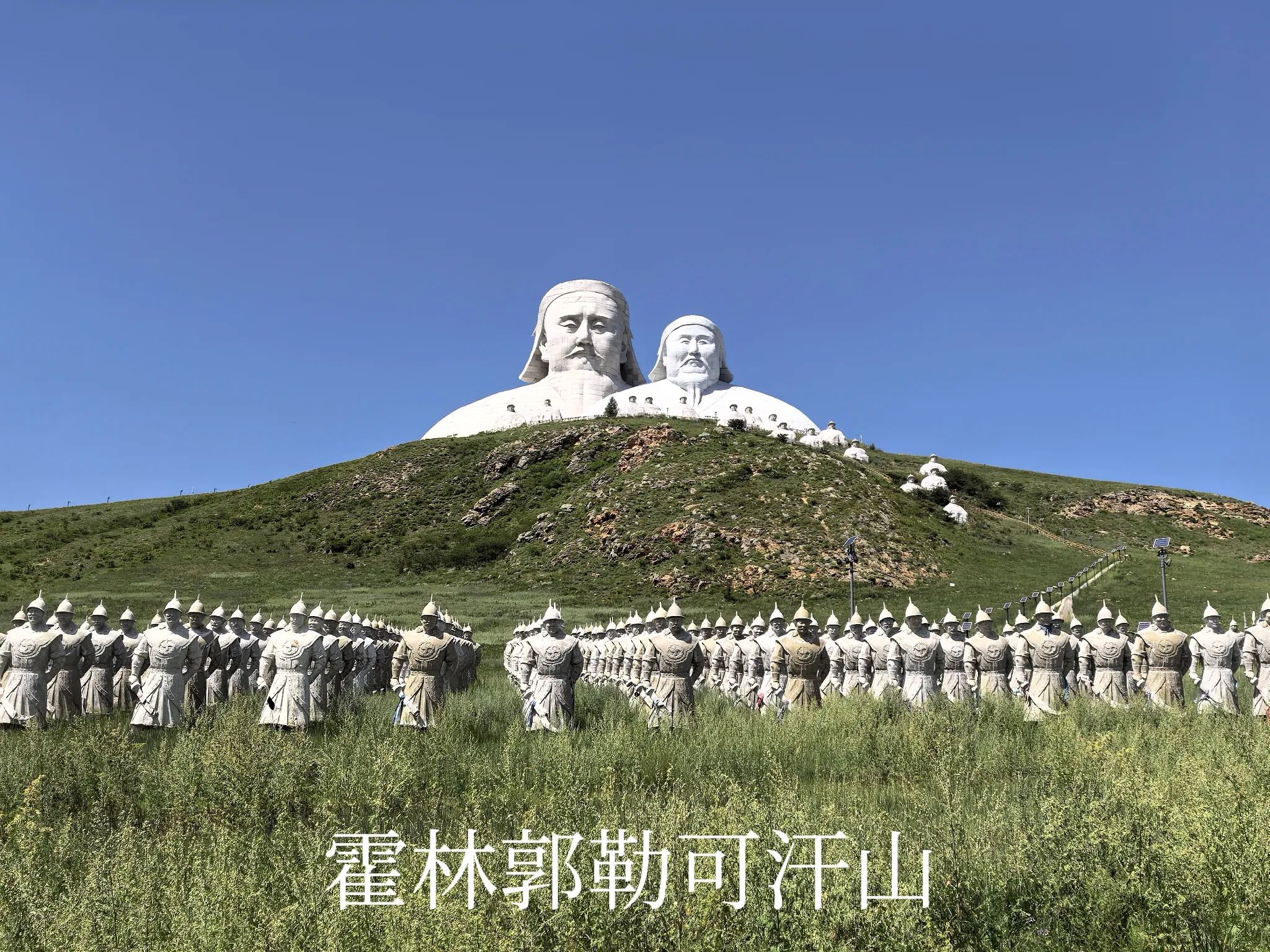 可汗山是简称,这是原来规划的度假区,名字叫浑迪音山旅游度假区,不知是因为经营状况不好还是违规建设,度假区的核心部分已经全部封闭起来,没有运营的迹象。游人只是在可汗山的山脚下,远距离观赏山顶的成吉思汗、忽必烈雕像,以及山脚的蒙元兵阵。来此打卡的游人还不少,也因此有当地牧民开展骑马穿越草原、蒙服拍照、餐饮等经营活动,招揽游客。