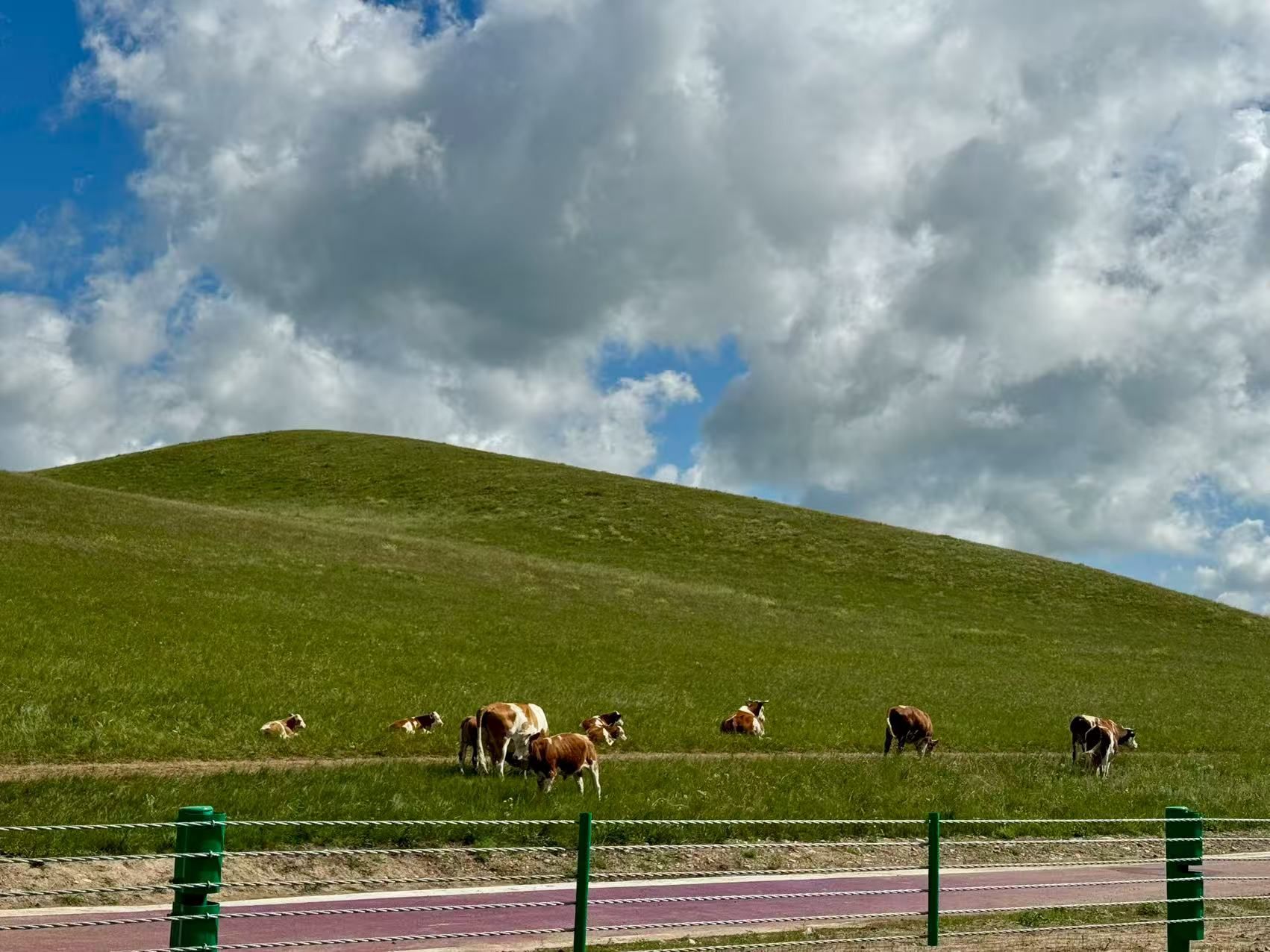 第二天,本来计划直达玉龙沙湖来,后来想想还是走达达线过去吧。从太仆寺旗上高速直达达里湖下高速,从达达线七点开始玩,刚下高速就有牧场,感觉一般,继续往下走,到了中段的达达线才好看,顺路深入贡格尔草原打开拍照。