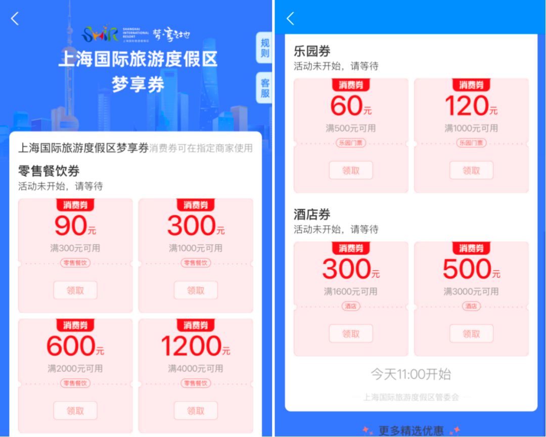 每周五11点,支付宝搜索【度假区梦享券】可领上海国际旅游度假区消费券,买乐园门票、零售餐饮和酒店都有优惠,单张券最高能减1200。