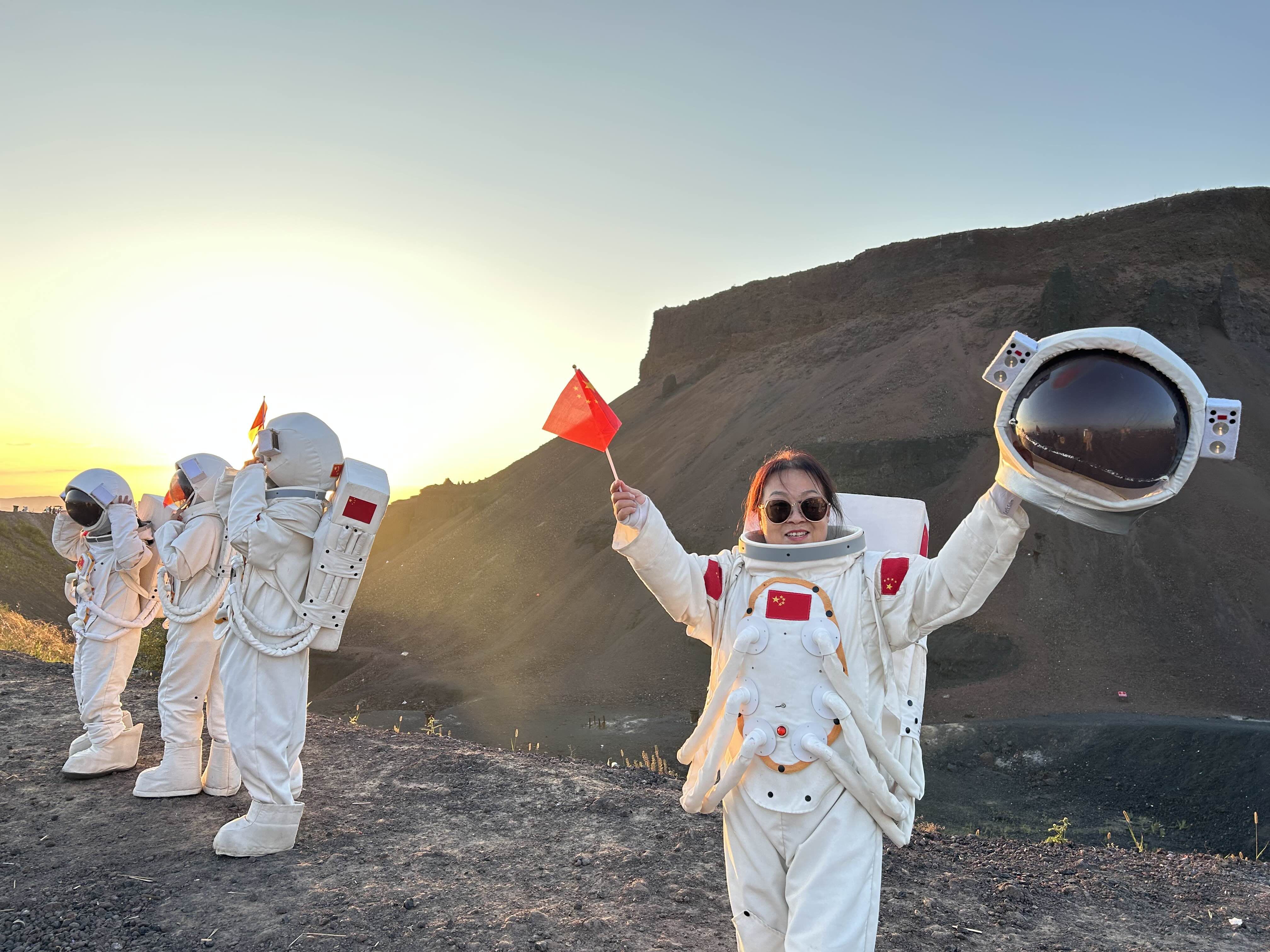 4号火山是一个转运站,北门乘车的旅客需要在此转车到另外一些站点。到了6号火山,也称为南炼丹炉。这座火山更让人惊艳,整座山黑得寸草不生,像被大地的怒火淬炼过,游人没法爬上去。这座火山是最热闹的,人很多,人们租赁上太空服,买上加特林,尤其孩子们更是欢欣,穿着太空服,配上彩色烟雾,拍出的照片就像是在月球表面一样。感觉这才是真正的火山遗迹,以前曾去过的海口火山和大同火山群等,相比来说真是小巫见大巫,不值一提了。我们也租了一套白色太空服,妻子穿上拍照。夕阳西下时,红通通的太阳挨着火山边缘,黑色的山体被染得发亮,美得让人说不出话。黑色火山,金色阳光,白色太空服,色彩斑斓,成了此行最惊艳的画面。