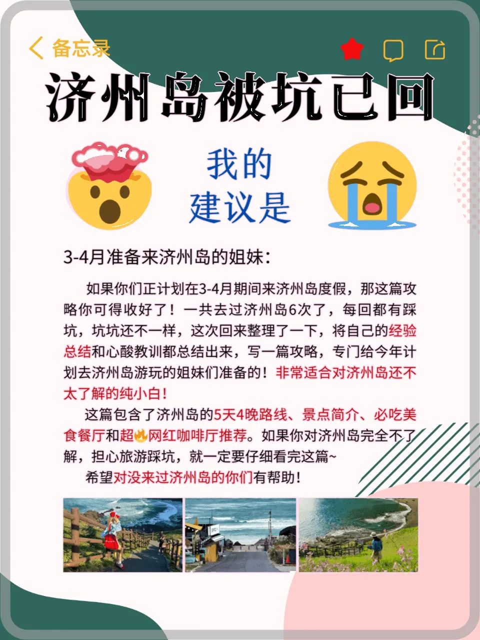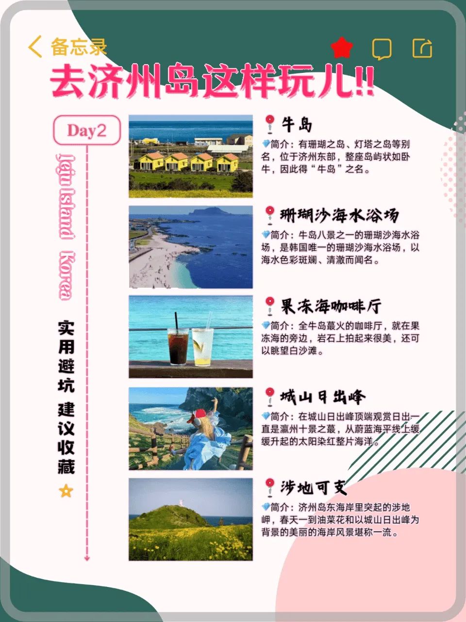 济州岛是韩国的一个度假胜地,以其美丽的自然风光、独特的文化和美食而闻名。六刷济州岛的老玩家整理的这份超全攻略,能让第一次去济州岛的人避开踩坑,玩出新花样。攻略包含了出行准备、景点行程、网红咖啡厅推荐、必吃美食清单和实用小贴士等内容。