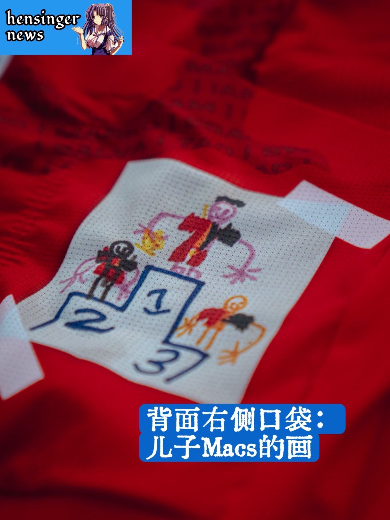 ️背后右侧口袋是儿子Macs的画:第一的位置是托马斯,第二的位置是Macs,第三的位置是彼时刚刚来到对内的卢卡斯·汉密尔顿;