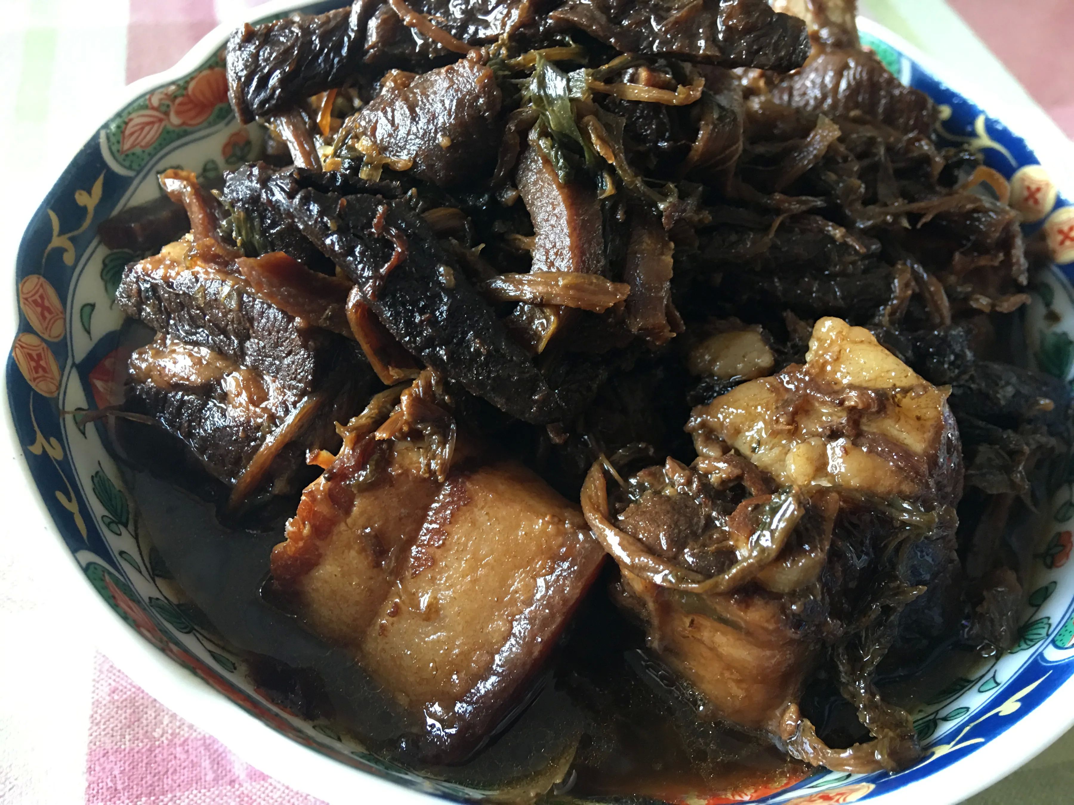 绍兴霉干菜是天下名物,也叫乌干菜,喻其色泽乌黑如檀。在我小时候,父母每次去绍兴探望祖父母回来,总要带上一大袋霉干菜,整棵腌晒而成,气色沉郁,状如绞紧了的拖畚头子,表面还附着点点白花。除了分送邻居,留下的可以吃很长时间。过年了就拿它与皮厚膘肥的五花肉小火慢煮,腴香浓郁,油而不腻,宜饭宜酒。