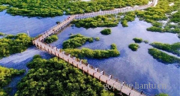 金海湾红树林是一处景色优美的滨海湿地,由红树林门景区、红树林生态观光区和疍家民俗园区等三部分组成。