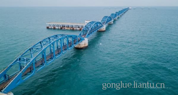 晴天白云下,海水清澈见底,桥一直延伸到海里,很是壮观,当地人喜欢到这儿海钓。