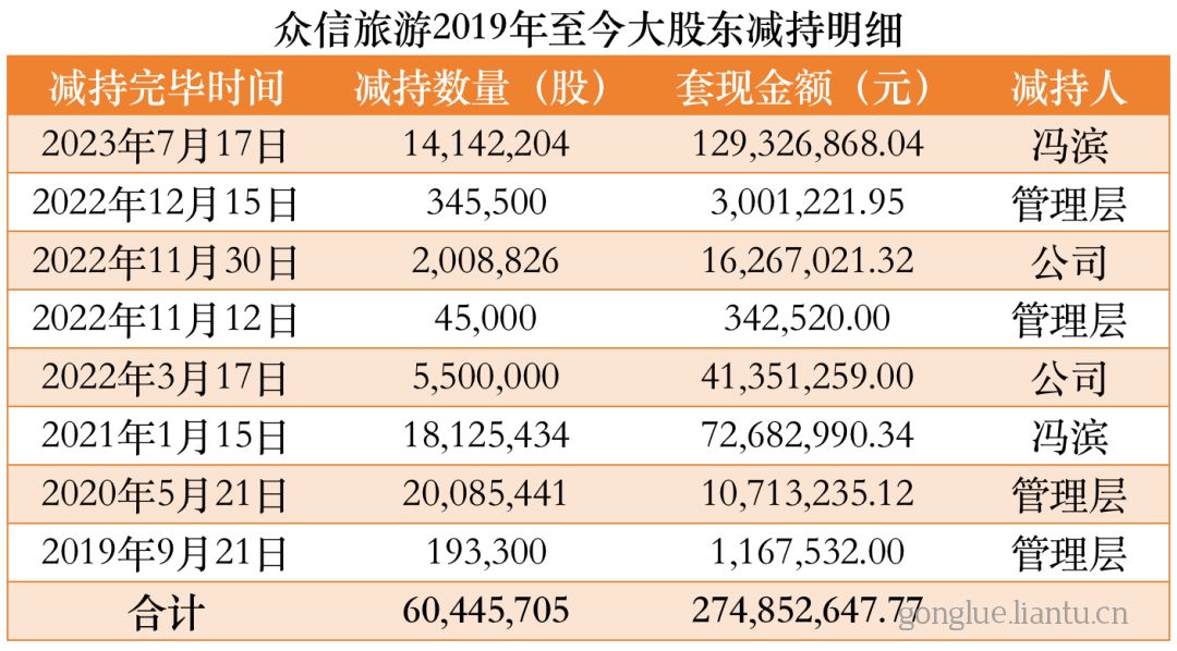 众信大股东累计减持股份6044.57万股,累计套现2.75亿元,其中实控人冯滨累计减持3226.76万股,累计套现2.02亿元,其它均为公司管理层减持。