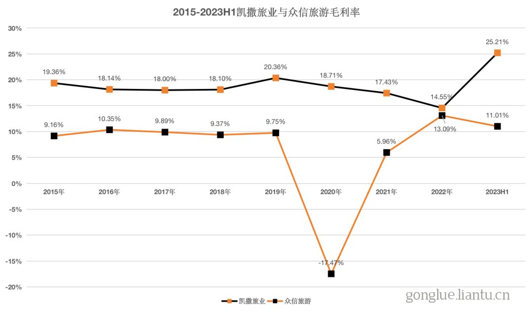 凯撒与众信的2023年中报,也直观地反映了这一点,两者的毛利率分别达到25.21%和11.01%,较2019年同期分别提升8.89个百分点和0.11个百分点,且达到了自2015年以来的最高水平。