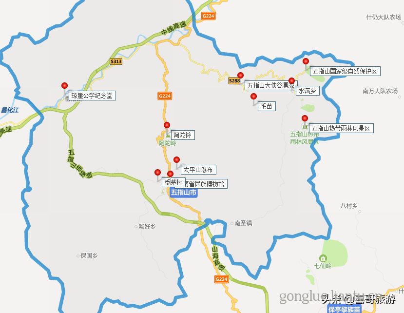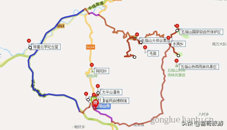 2、五指山市十大景点自驾游行程路线:五指山-五指山热带雨林风景区-水满乡-五指山国家级自然保护区-五指山大峡谷漂流-五指山毛岸苗村-琼崖公学纪念亭-番茅黎寨-阿陀岭-太平山瀑布-民族博物馆-五指山。