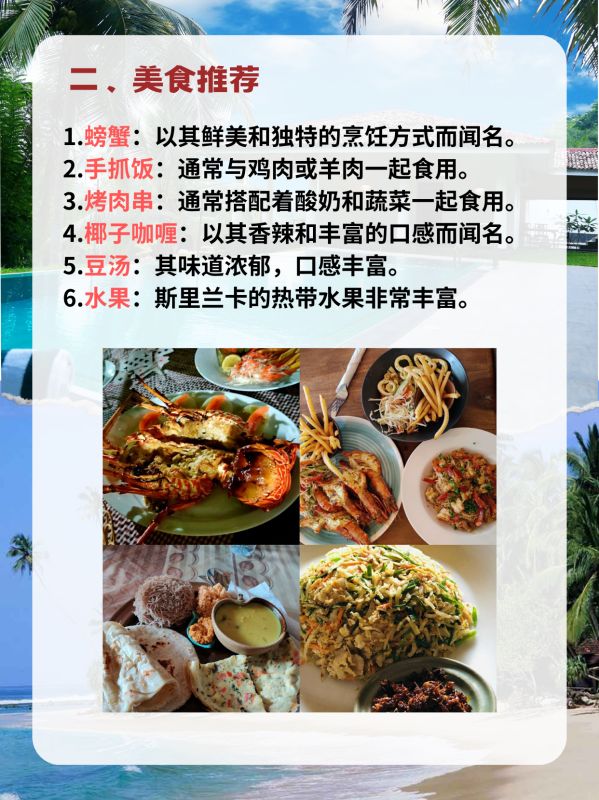 1.螃蟹:斯里兰卡的螃蟹以其鲜美和独特的烹饪方式而闻名,特别是在康提湖附近的餐馆。