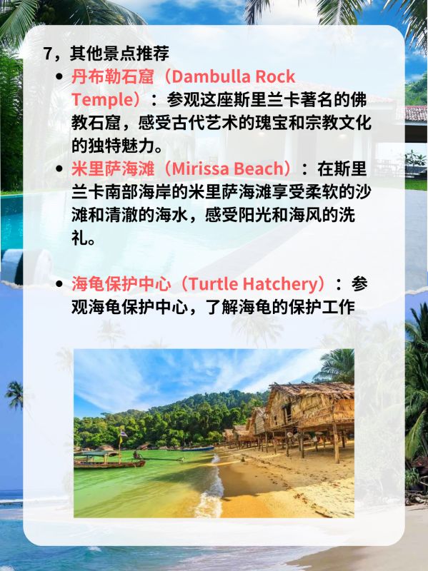7.环保:斯里兰卡是一个美丽的岛国,游客在旅行过程中应当尊重自然,不破坏环境,不随意丢弃垃圾,尽量减少对当地环境的影响。