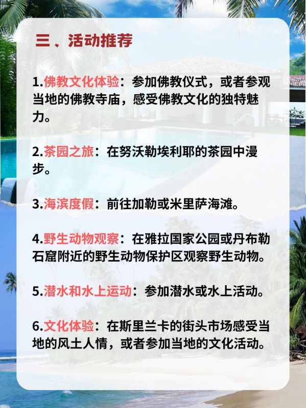 1.佛教文化体验:斯里兰卡是佛教圣地之一,可以参加佛教仪式,或者参观当地的佛教寺庙,感受佛教文化的独特魅力。