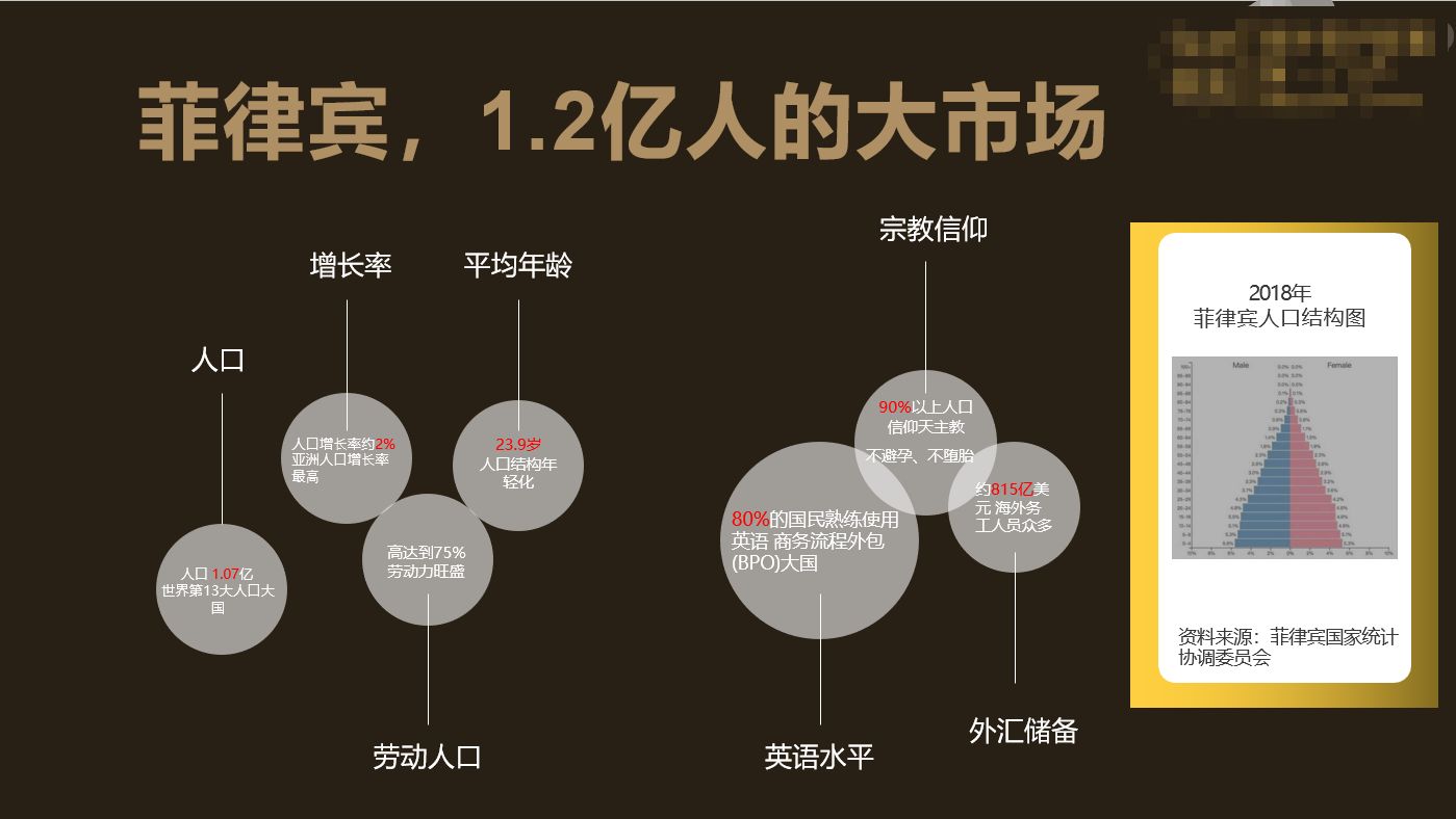 1. 近年来菲律宾GDP增长稳健,人口增长速度位列东南亚前沿,1.2亿人口促使内需市场旺盛,加上先前受美国殖民后的影响,因此整体的法律制度和语言环境基本与国际市场接轨。